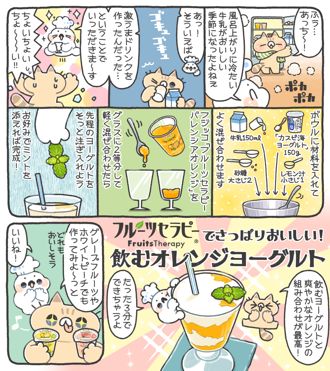 ヨーグルト+牛乳+砂糖+フルーツセラピーを混ぜるだけ!たった3分で、お風呂上がりにもうれしいさっぱり&ひんやりドリンクの完成🙌