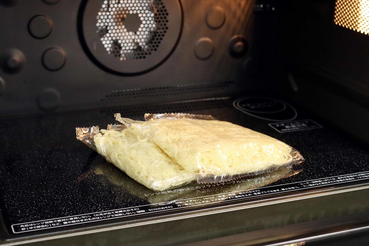 まずは焼きそば麺の袋をちょっぴり破いて、500wで2分レンチン!こうすることで麺がパサつかず、もっちりした食感になります