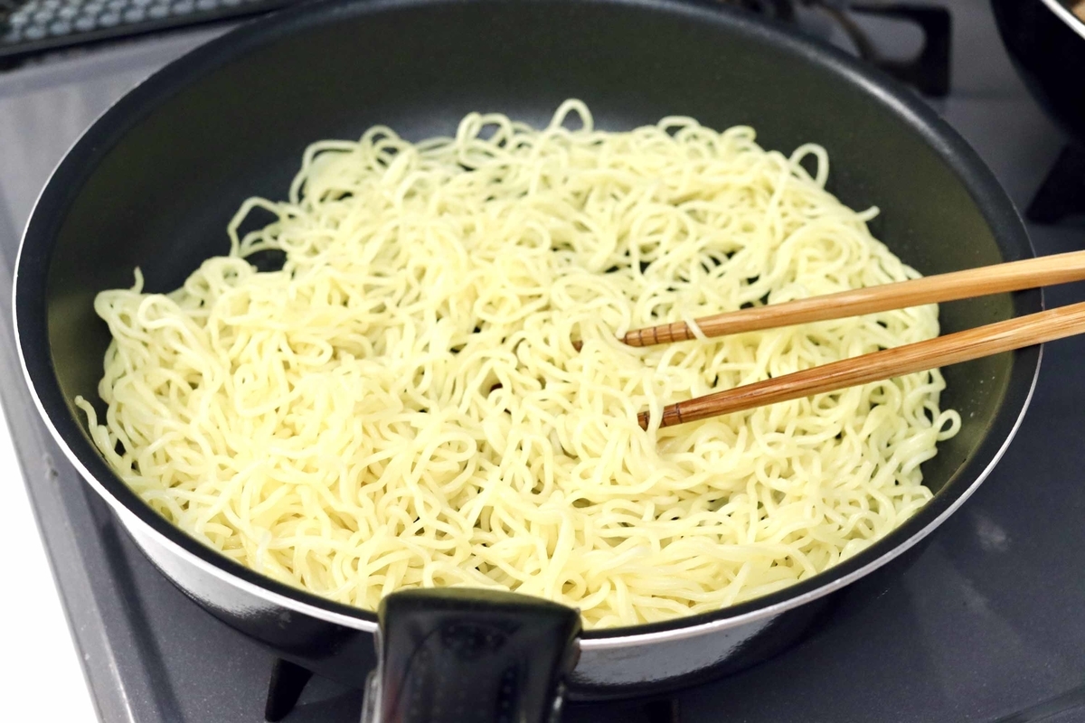 こちらの麻婆なす麺は、焼きそば麺を使ったお手軽あんかけ麺となっております。油で揚げずにフライパンでカリッと焼いていくよ。