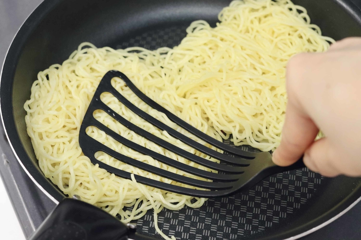 レンチンが終わった麺は、油をひいたフライパンの上にのせ、ほぐしつつカリカリになるまで焼いておきましょう(2等分する)