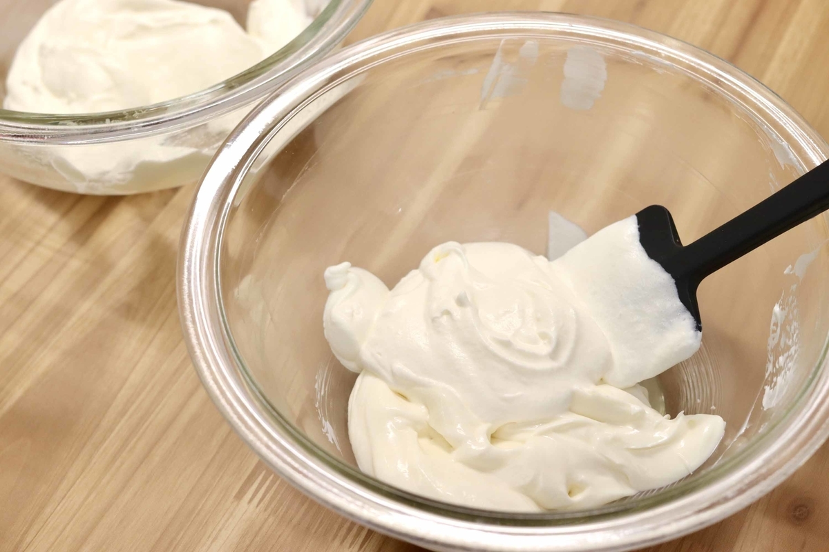 2回に分けて加え混ぜましょう!(2回に分けることで気泡がつぶれにくくなり、ふわっとした食感に仕上がるよ)