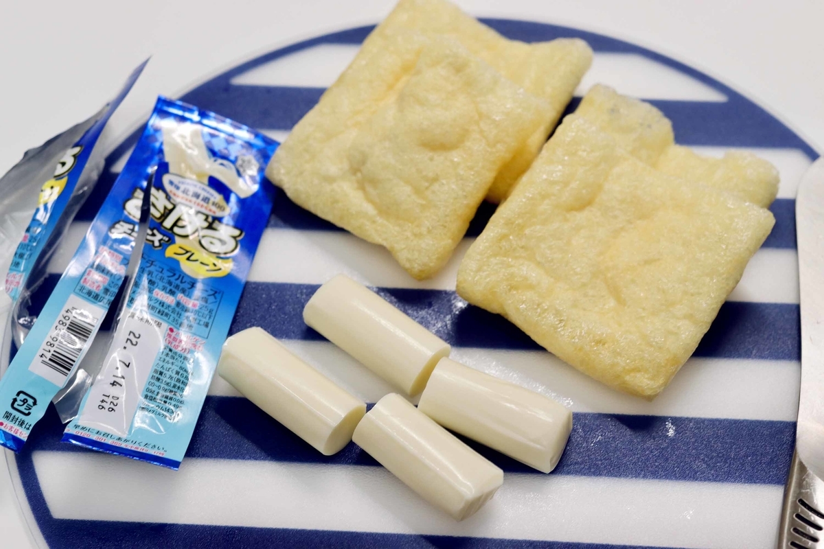 油揚げに卵とチーズを1つずつ入れたら、口を楊枝で止めましょう(小皿に卵を割って、片手で油揚げ口を開きながら卵を流すと上手に入れられます)