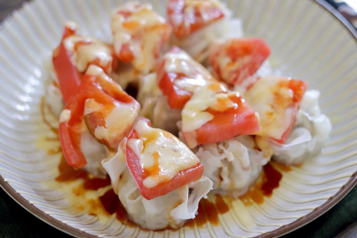 シュウマイにトマトとチーズを乗せて通常通りレンチンしたら、タバスコと醤油を垂らすだけ。もともと肉感ボリューミーなシュウマイが、更にジューシーに✨