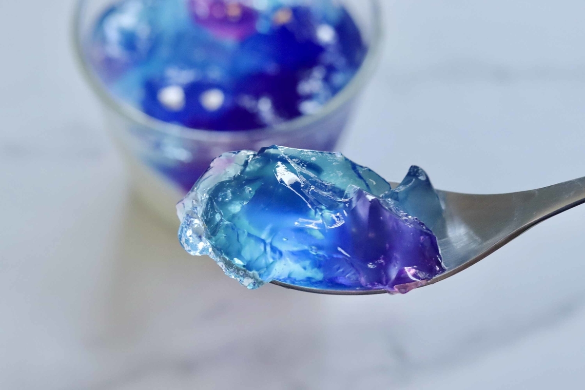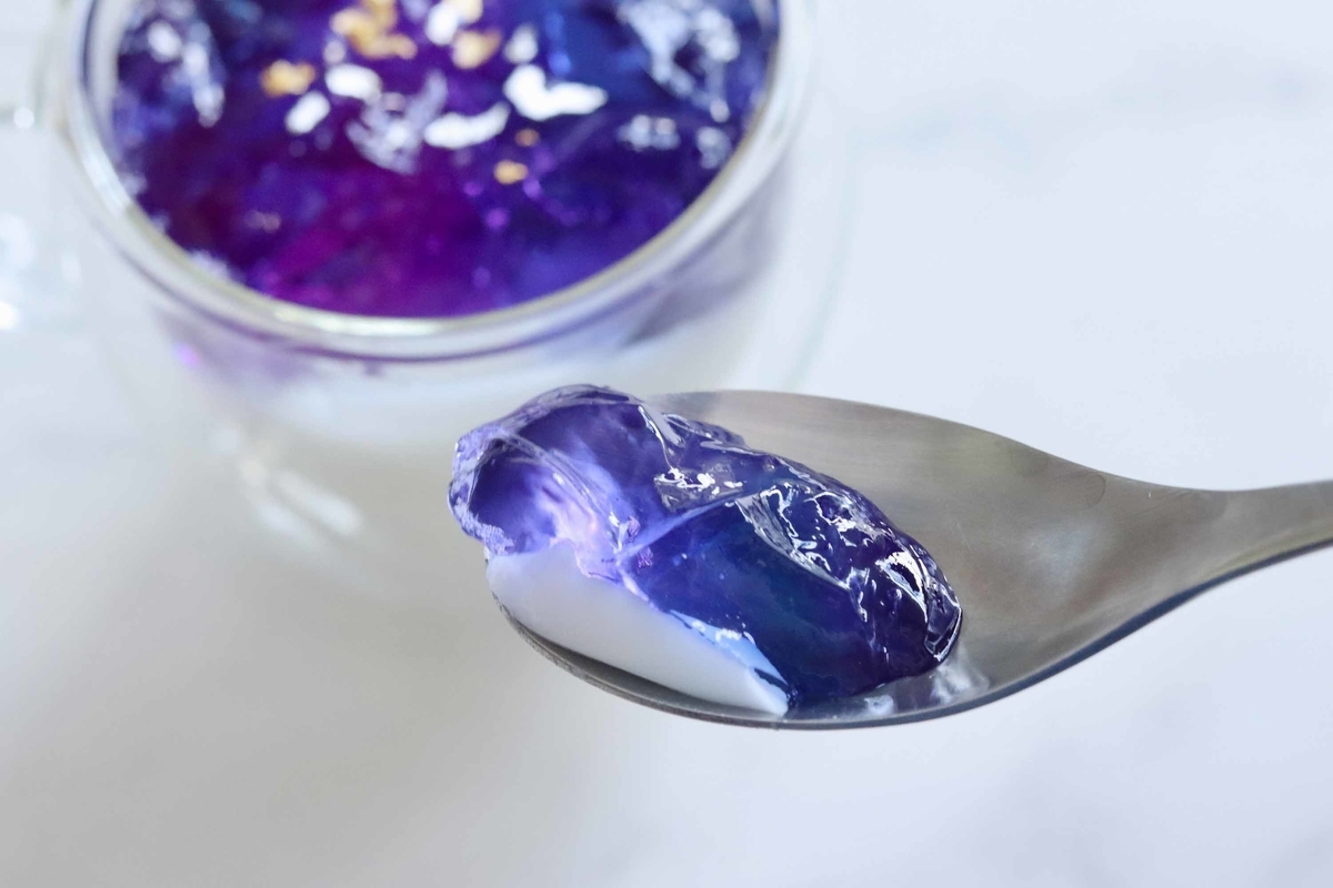 下の白い層がカルピスゼリー、上の青と紫の層がバタフライピーゼリーになっています。着色料を使わずに、こんな綺麗な色が作れちゃうっていいよね🙌