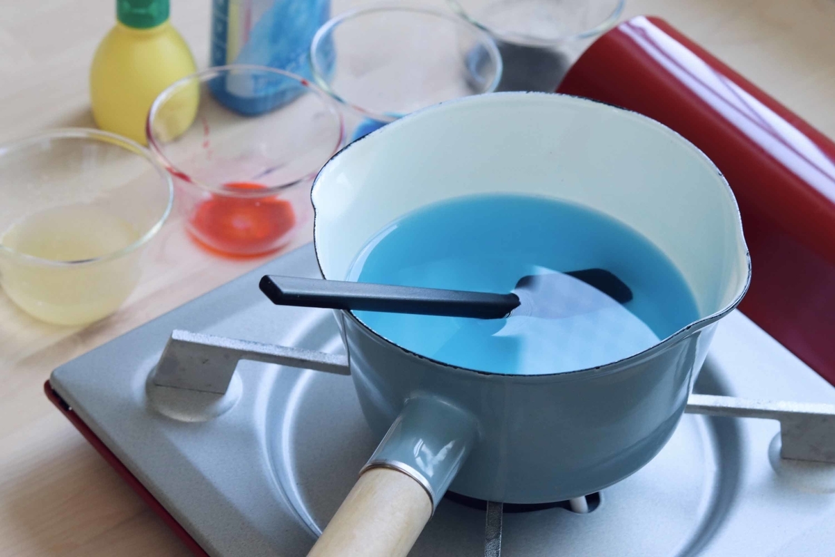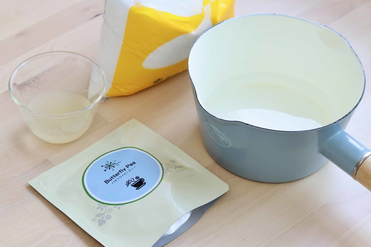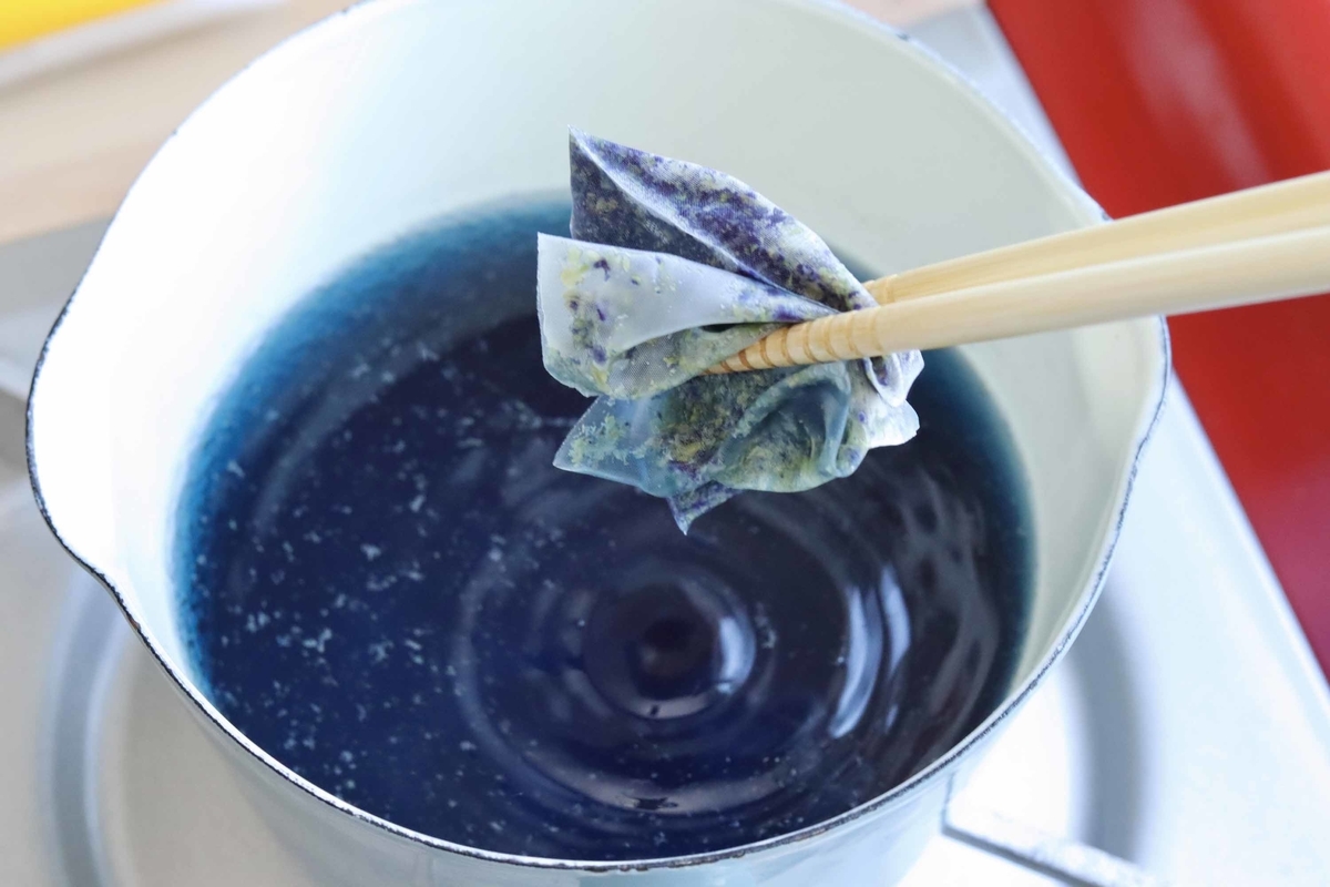小鍋にDを入れ、青色を煮出していきます。濃い青色になったらバタフライピーのティーパックを取りだし、沸騰直前で火を止めましょう
