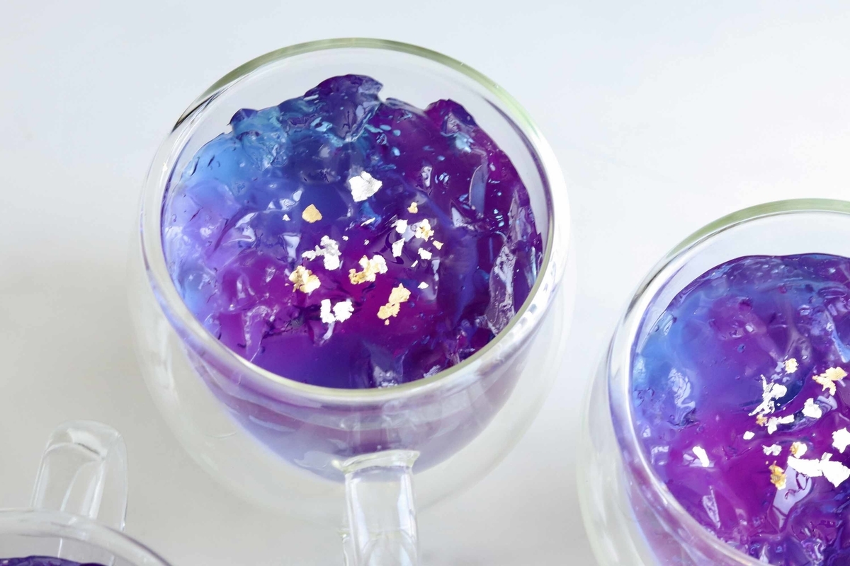あとはブルーハワイゼリーを冷やし固めて、カルピスゼリーの上にランダムにのせ、最後にアラザンや銀箔・金箔を上に散らせば完成~!こちらもバタフライピーに負けないくらい綺麗なのでオススメです👍