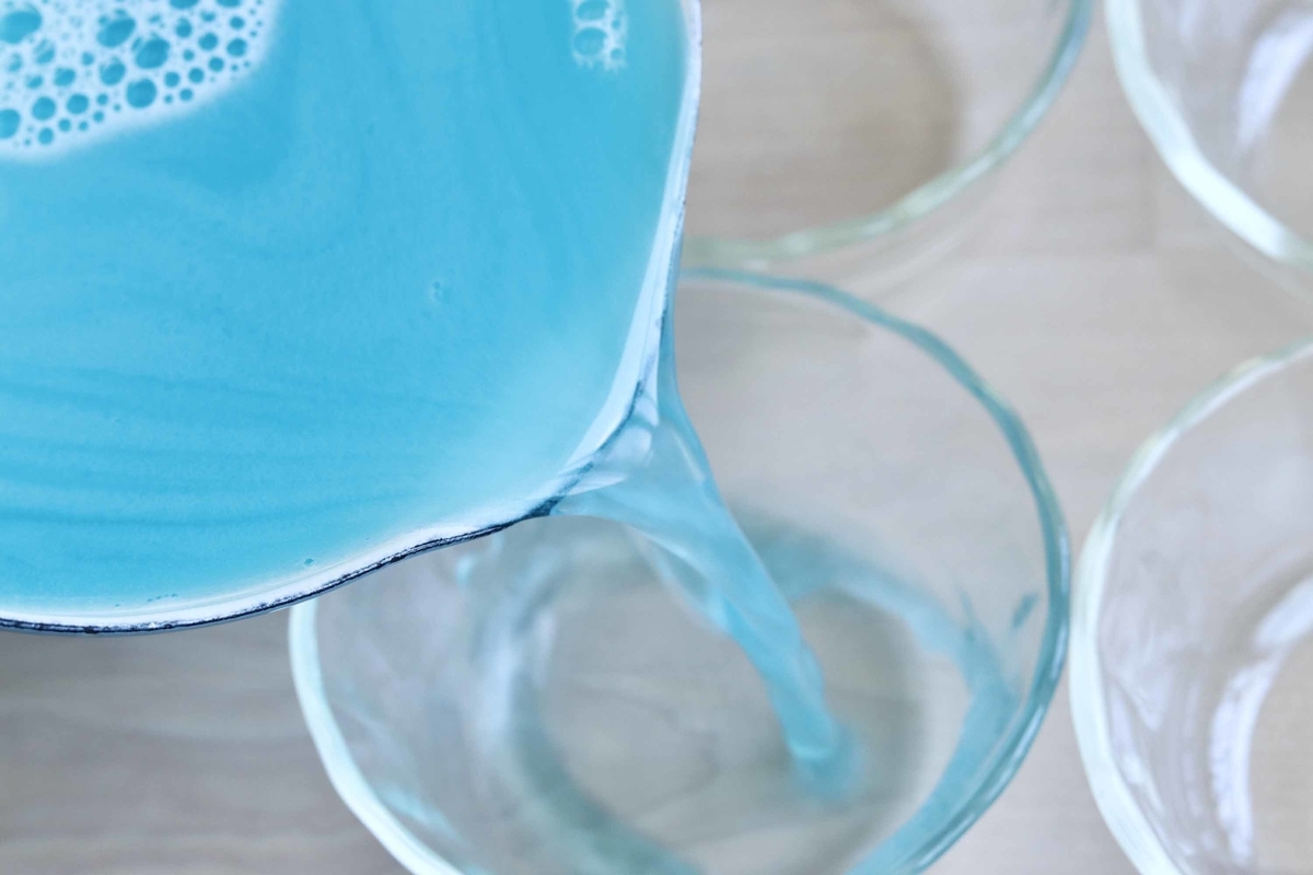 斜めにカルピスゼリーを入れる事で、上から見た時に綺麗な濃淡がついて綺麗に仕上がりになります。また、バタフライピーとレモン汁で青と紫色の2色を作ってあげることで、青⇔紫のグラデーションもできちゃう!