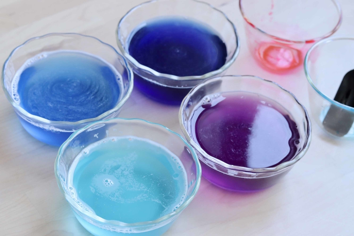 片方はそのままの青、もう片方にはレモン汁を好きなだけ加え、好みの赤紫色を作ったら冷蔵庫で冷やし固めます。