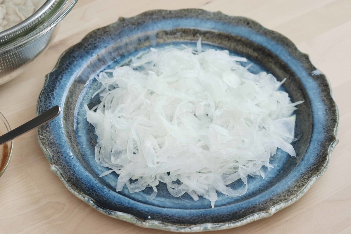 今回は玉ねぎを使用しましたが、レタスやトマトに変えてもいいし、お肉も鶏肉に片栗粉をまぶして茹でた「水晶鶏」に変更しても◎