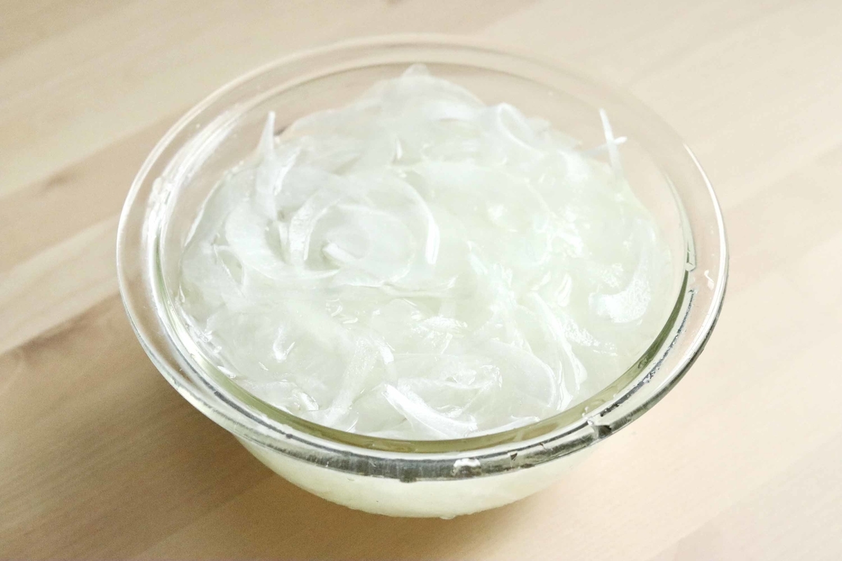 新玉ねぎ半分〜1個はスライスし、水を変えつつ30分〜1時間浸しておきます。こうすることで辛みを抑えた美味しいスライスオニオンに!使用するときは、水っぽくならないようによ~~~く水を切ってね