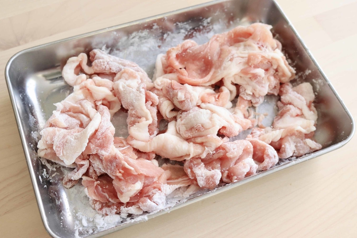豚薄切り肉を食べやすいサイズにカットしたら(こま肉ならカットしなくてOK)塩→片栗粉の順でまぶします