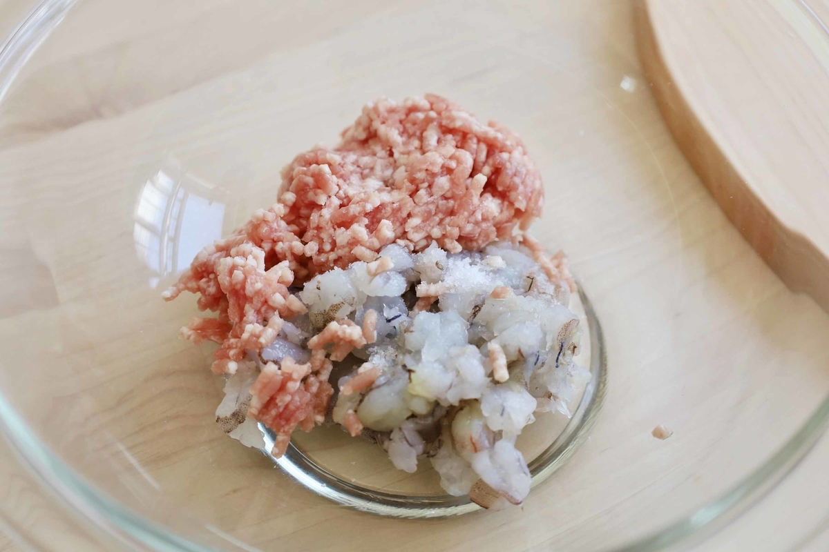 えびは洗って皮をむきます。むくとだいたい80gくらいになるかと!それを粗めに包丁で叩きましょう。