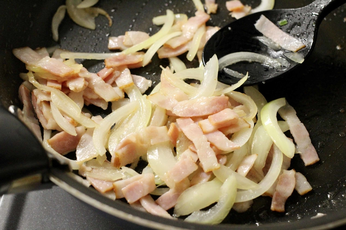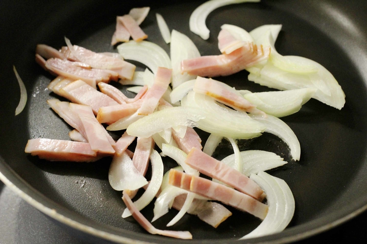 フライパンに油をひいたら、ベーコンと玉ねぎを炒めましょう