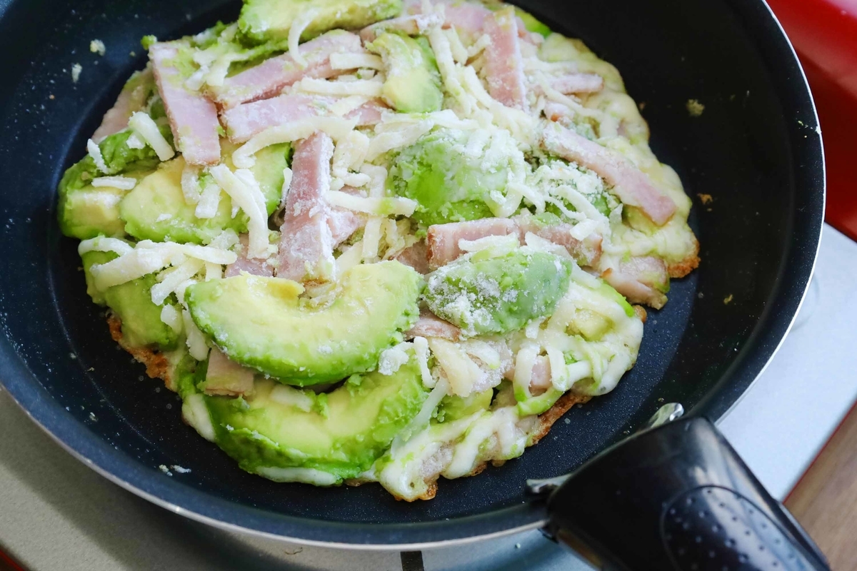 油をひいたフライパンにIN!へらなどで形を整えて中火で底がガリガリになるまで焼いていきましょう。今回の具材はすぐに火が通る食材なので、蓋をしなくてOKです!