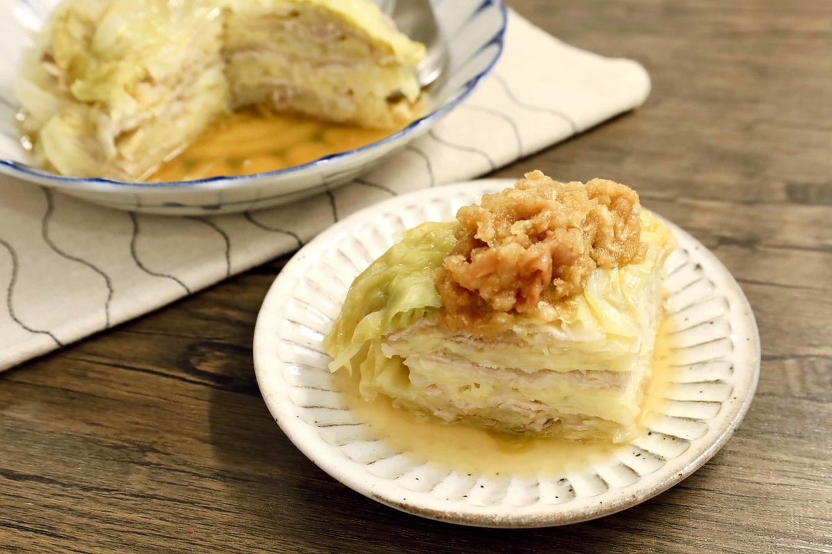簡単に言うと、鍋にキャベツと豚バラを交互に重ね、日本酒+和風だしを加えて30分煮たものに、梅みぞれだれをかけたやつ〜! これはね…ほんと体が喜ぶ、ホッとする料理です。沁みる~~~~~~!