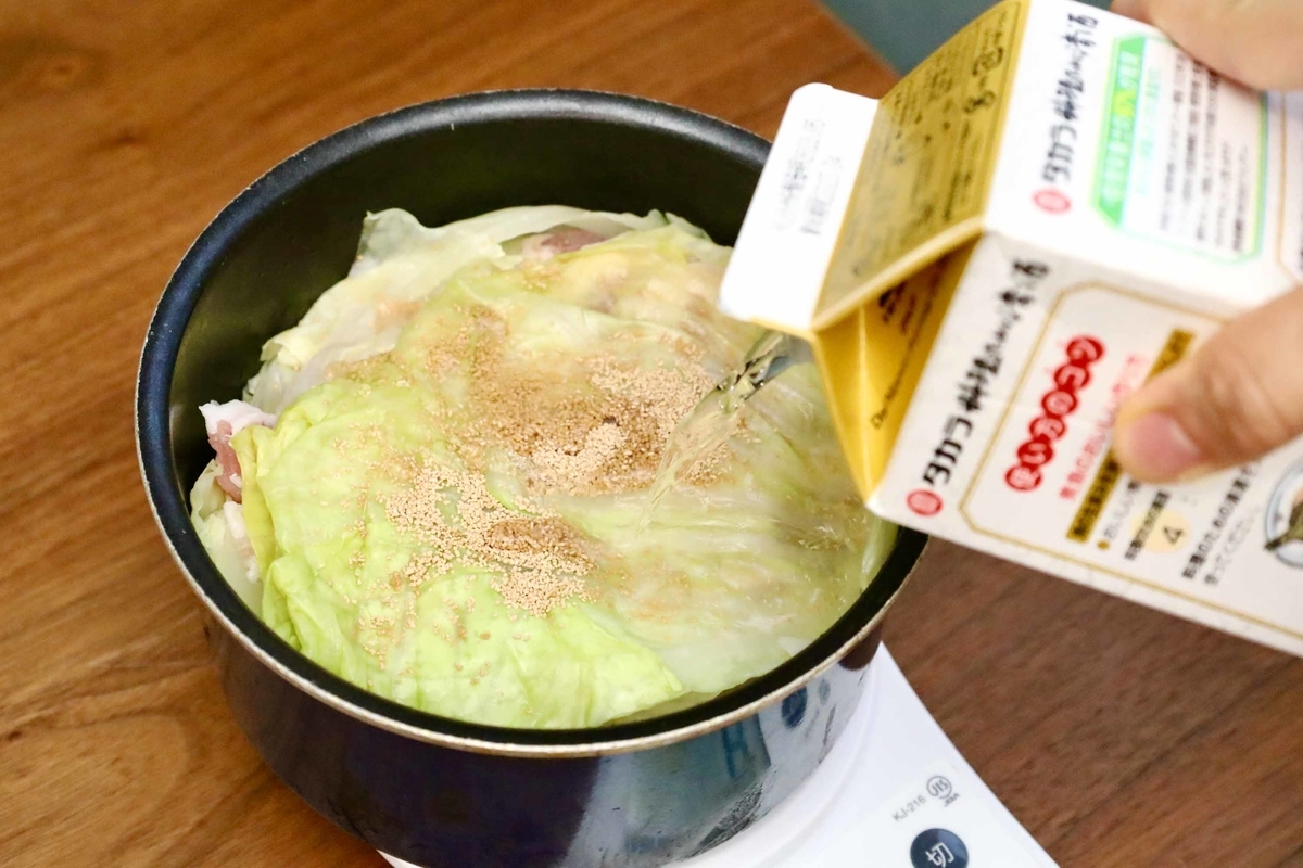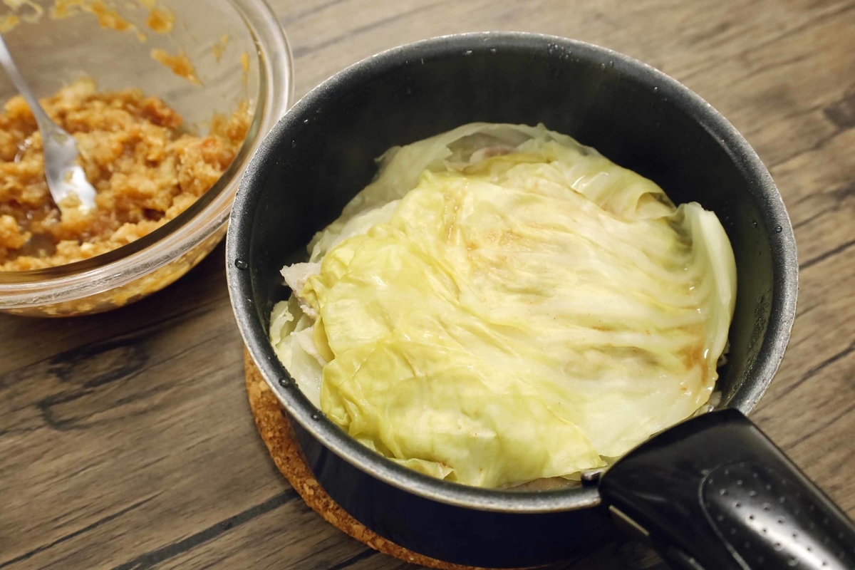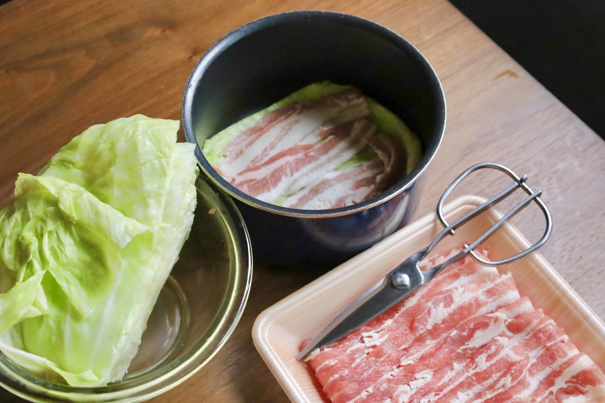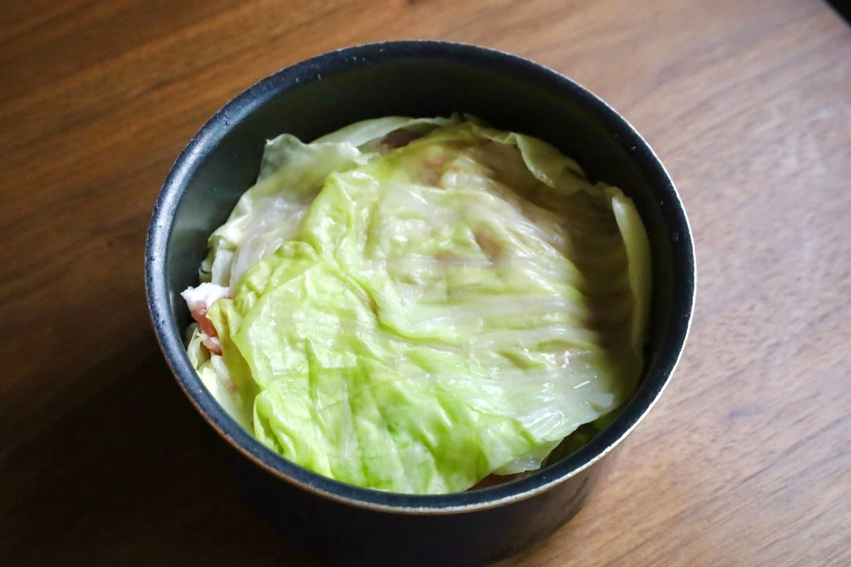 小鍋にキャベツと豚バラ肉250gを大雑把に交互に(キャベツ1枚ずつではなく、2~3枚ずつ重ねる)重ねたら