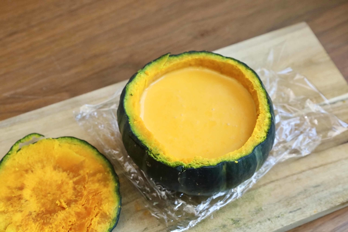 また、レンチン後のかぼちゃはめちゃ柔らか。くり抜く際に底が割れたりすると、プリン液が漏れる原因になってしまうので、優しく慎重に作業してね!