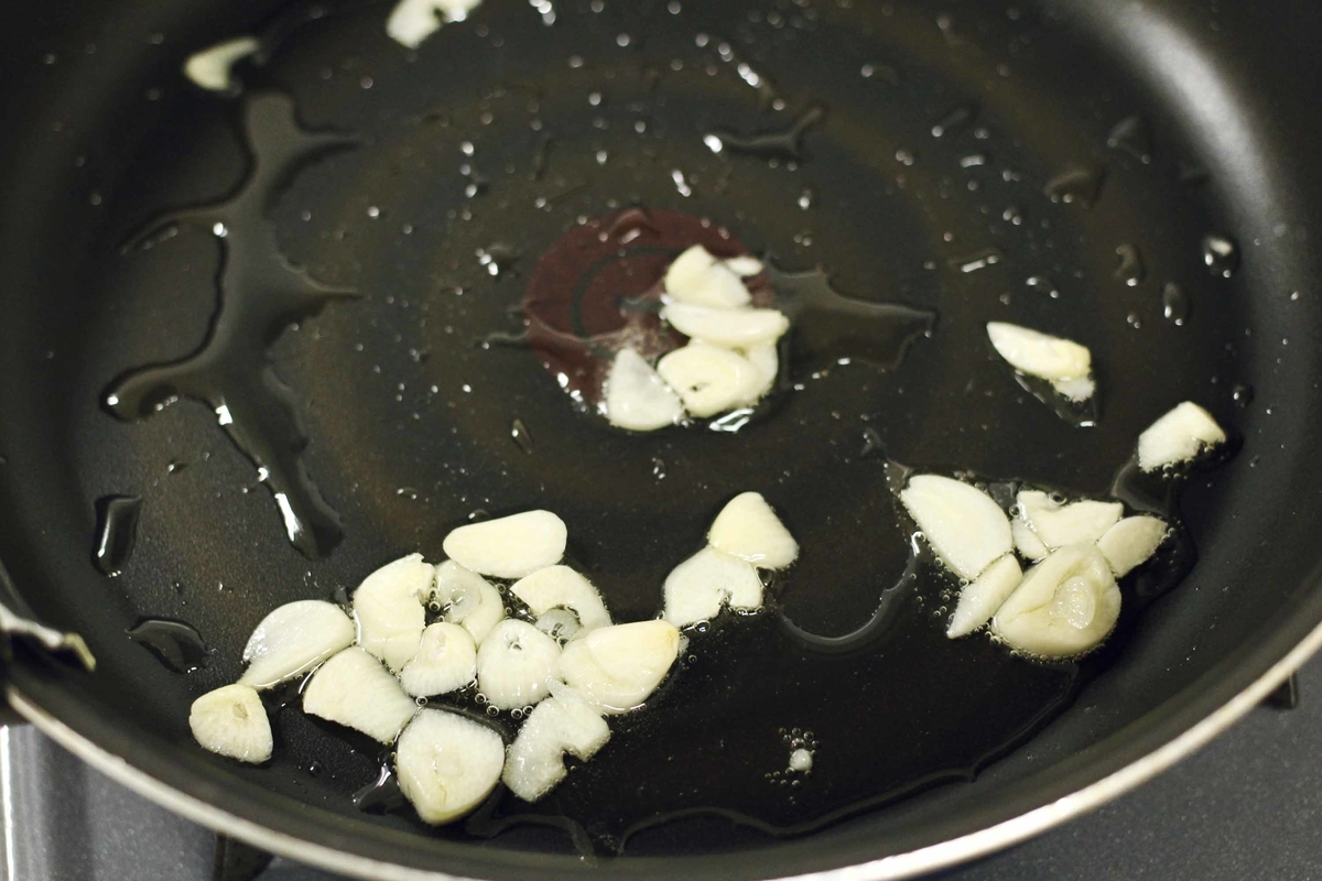 油をひいたフライパンににんにくスライスを入れたら、香りが出るまで弱火で炒めます