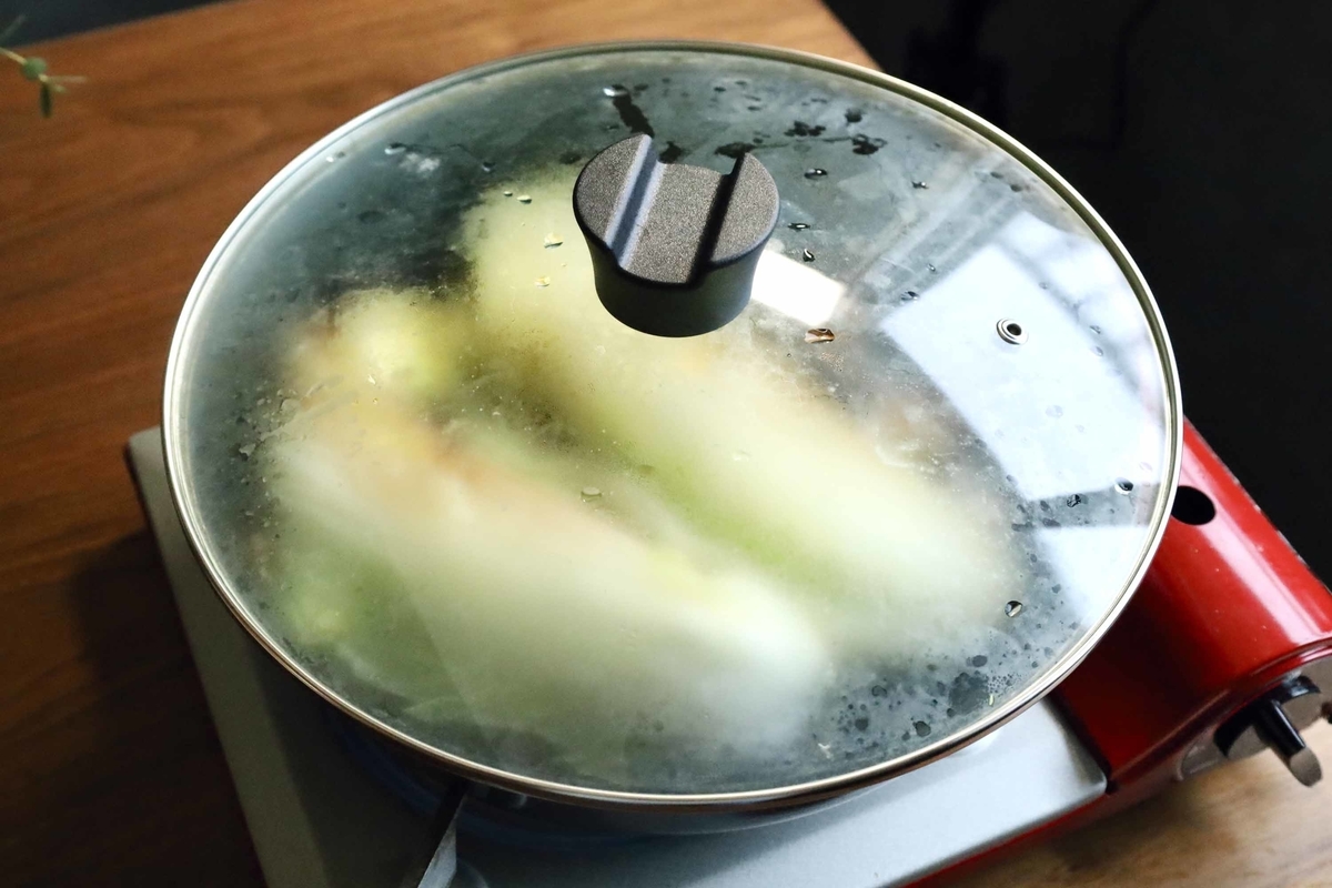 白菜4分の1は、フライパンに入る大きさになるまで外の葉を取り、縦半分に切っておきましょう