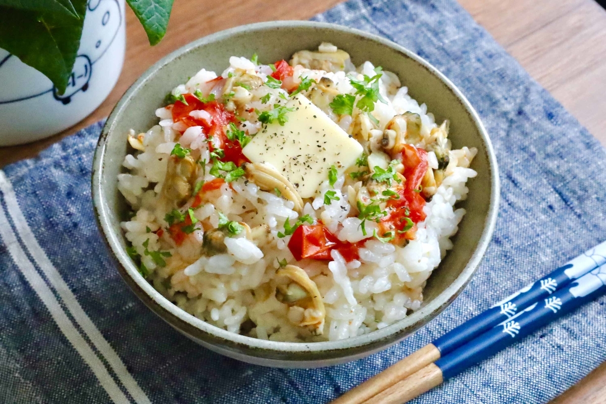 あさり缶+トマト+にんにくを一緒に炊くだけなのに、びっくりするほど美味しい✨オリーブオイルを回しかけて炊飯すれば、ご飯同士もくっつかず、しっかりパラパラに仕上がります。