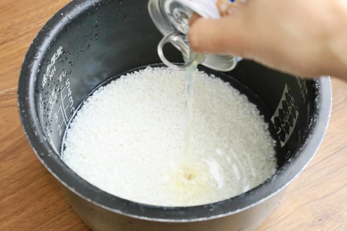 炊飯窯にお米を入れたら、あさり缶の汁だけ投入!