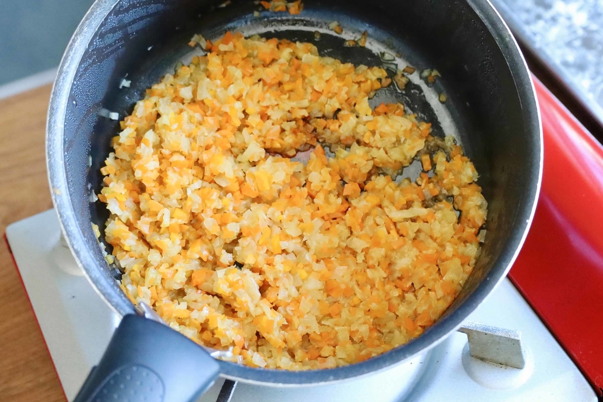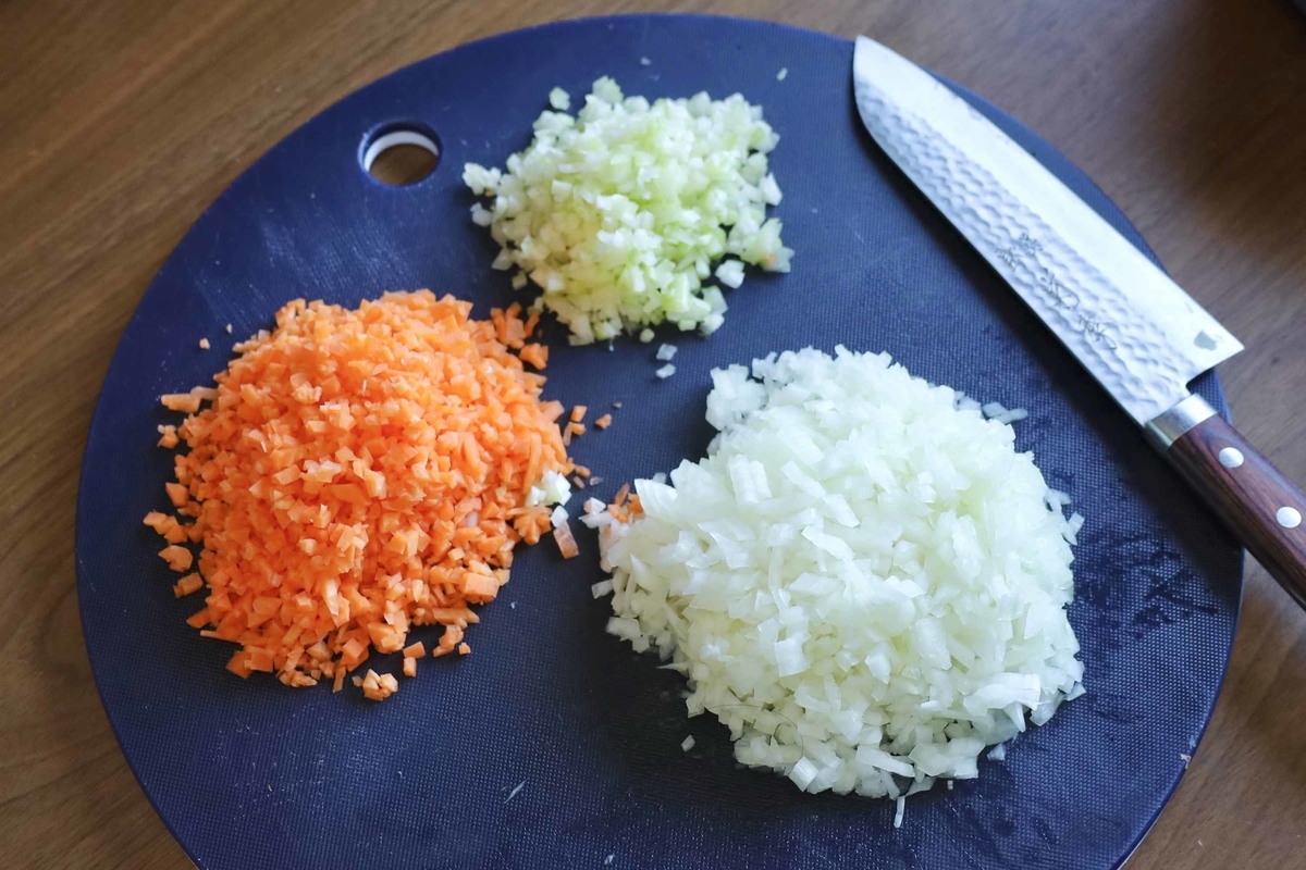 そうそう。今回はソフリットに玉ねぎ、セロリ、にんじんを使っていますが、玉ねぎだけで作ってもOKだよ~~!その場合は玉ねぎ1個半にしてね✌