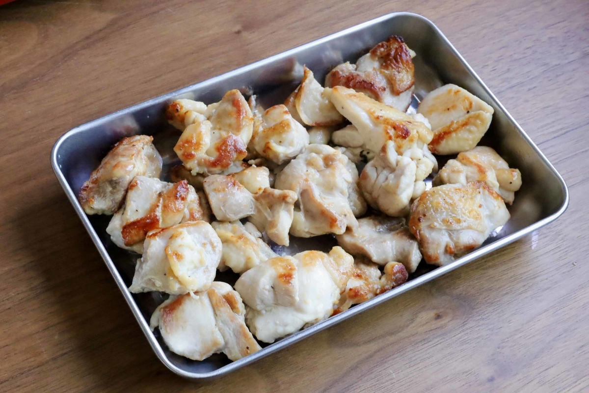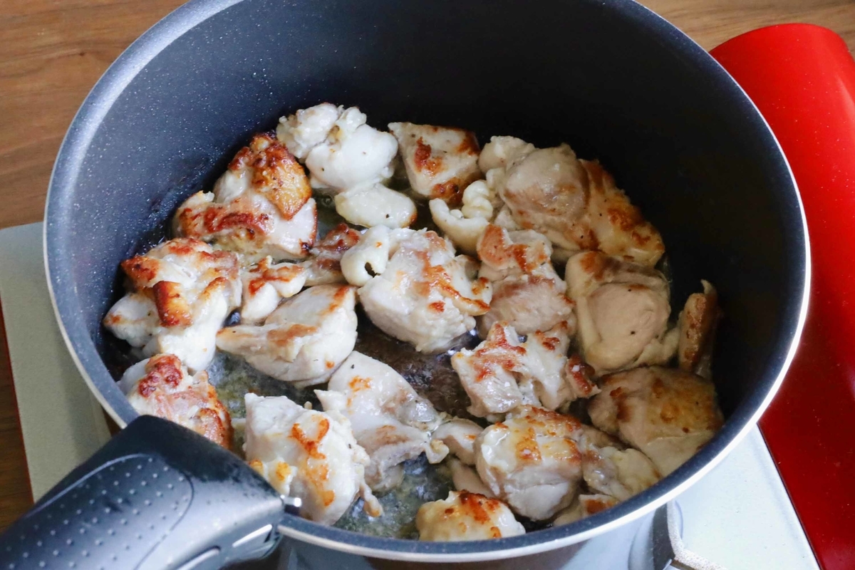 厚手の鍋で油大さじ半分を熱したら、皮目が下になるように鶏肉を入れ