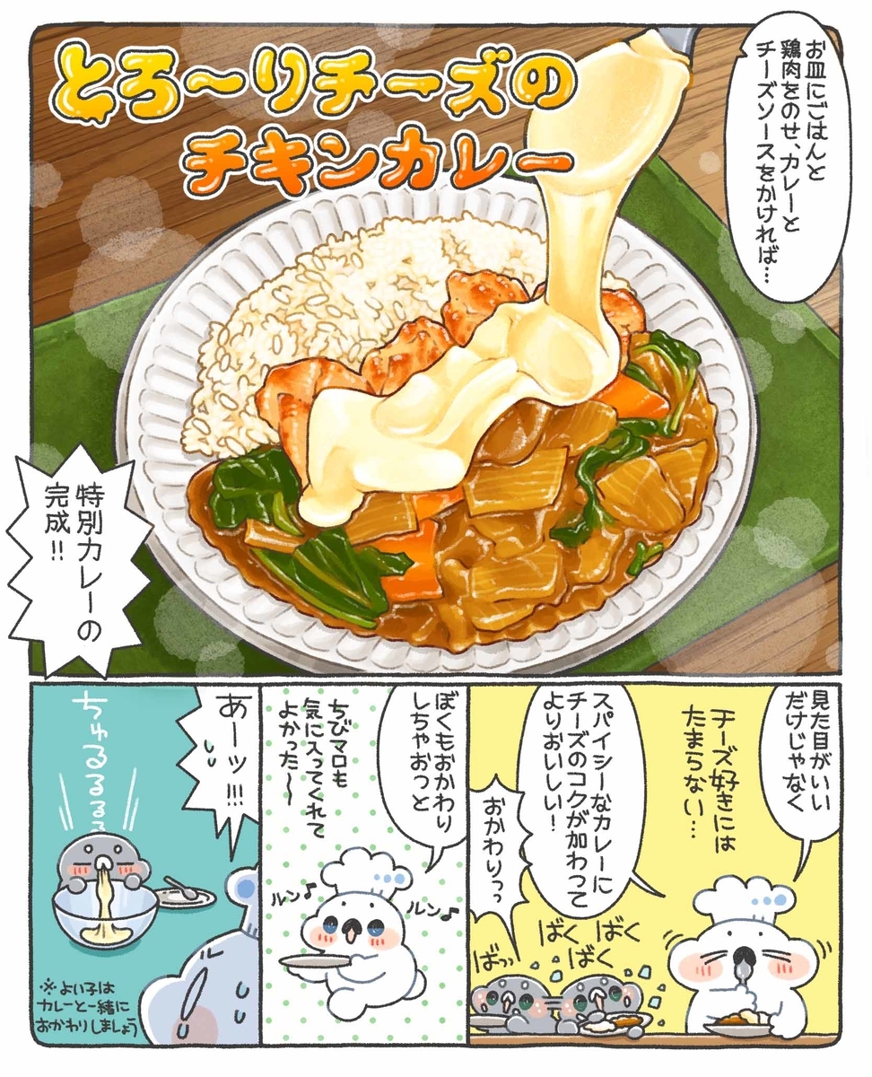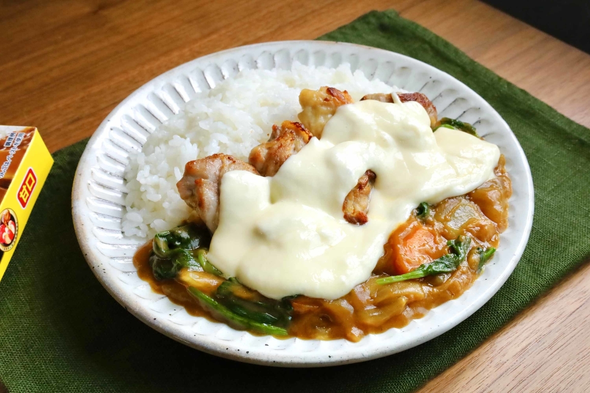 お皿にごはん+鶏肉を乗せ、カレー+チーズソースをかけて召し上がれ🥄