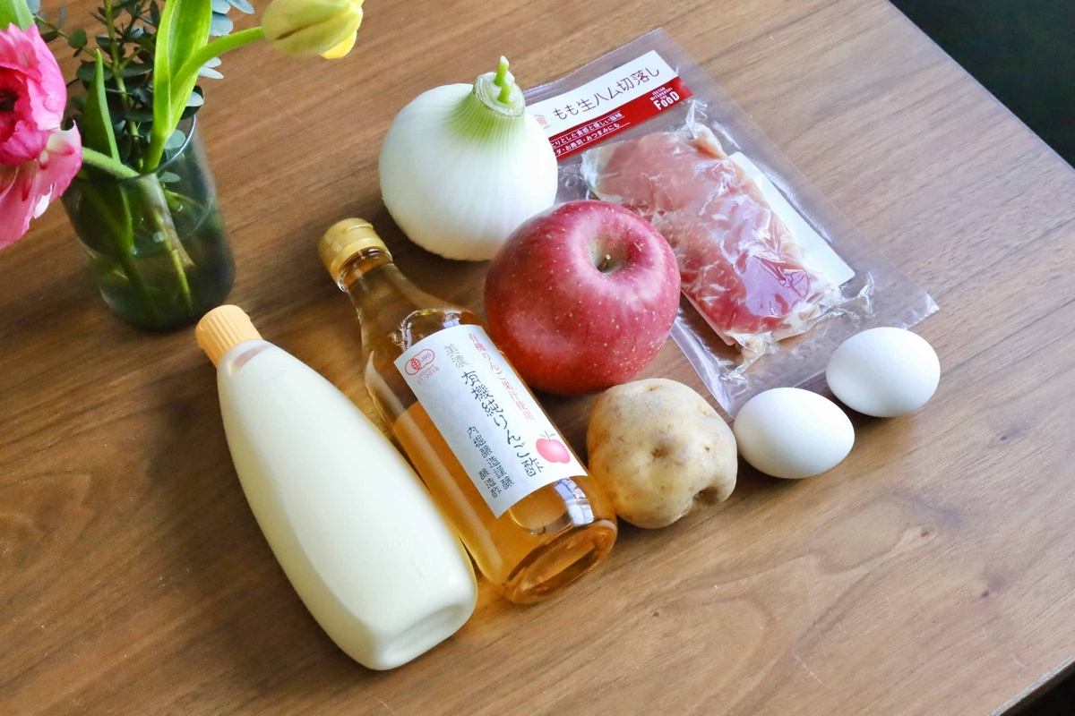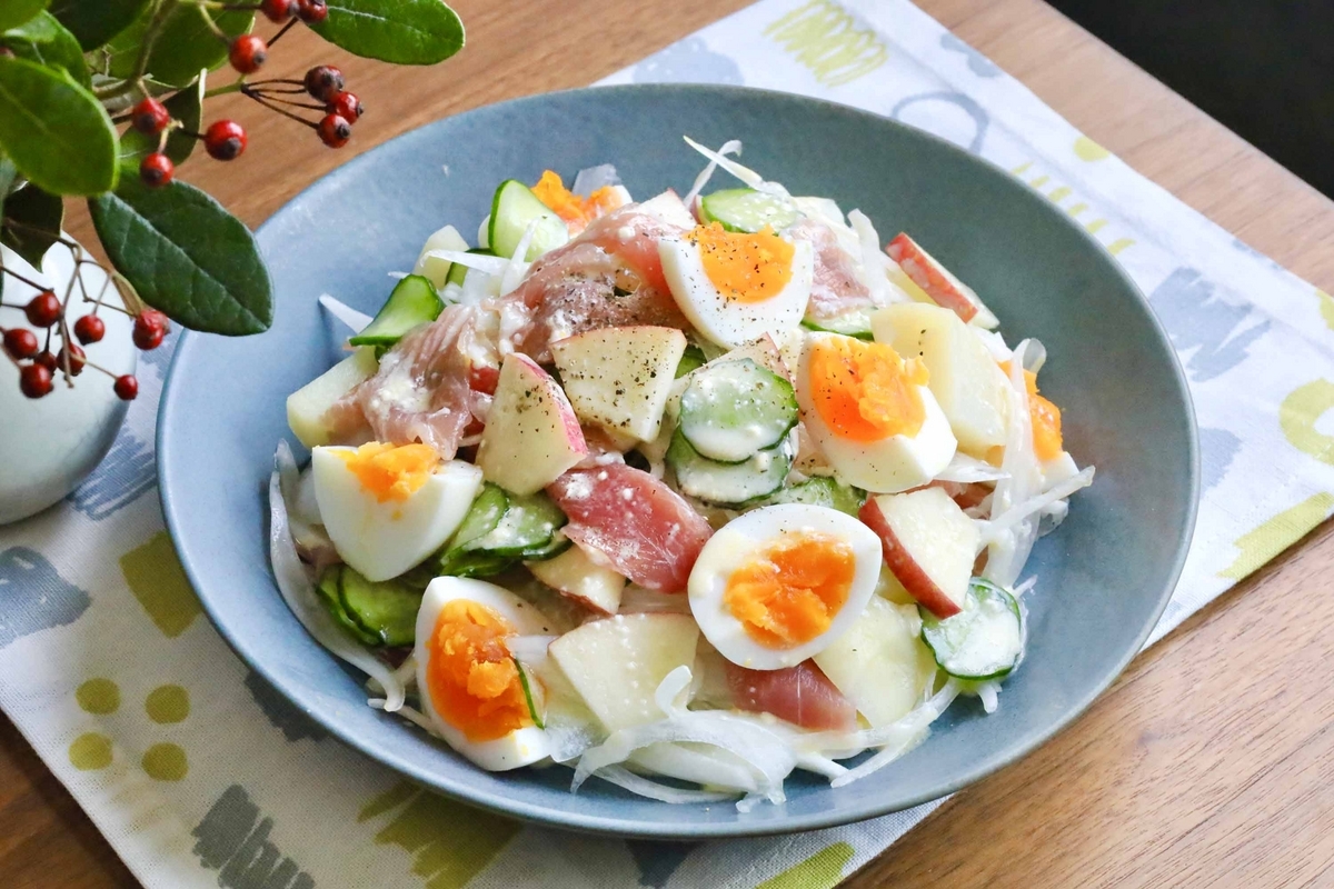 今回は撮影するということもあり、いろどりに気を使って「きゅうり・卵・生ハム」を加えていますが、新玉ねぎとりんごの2品だけでも充分美味しいです!(気を使うな)