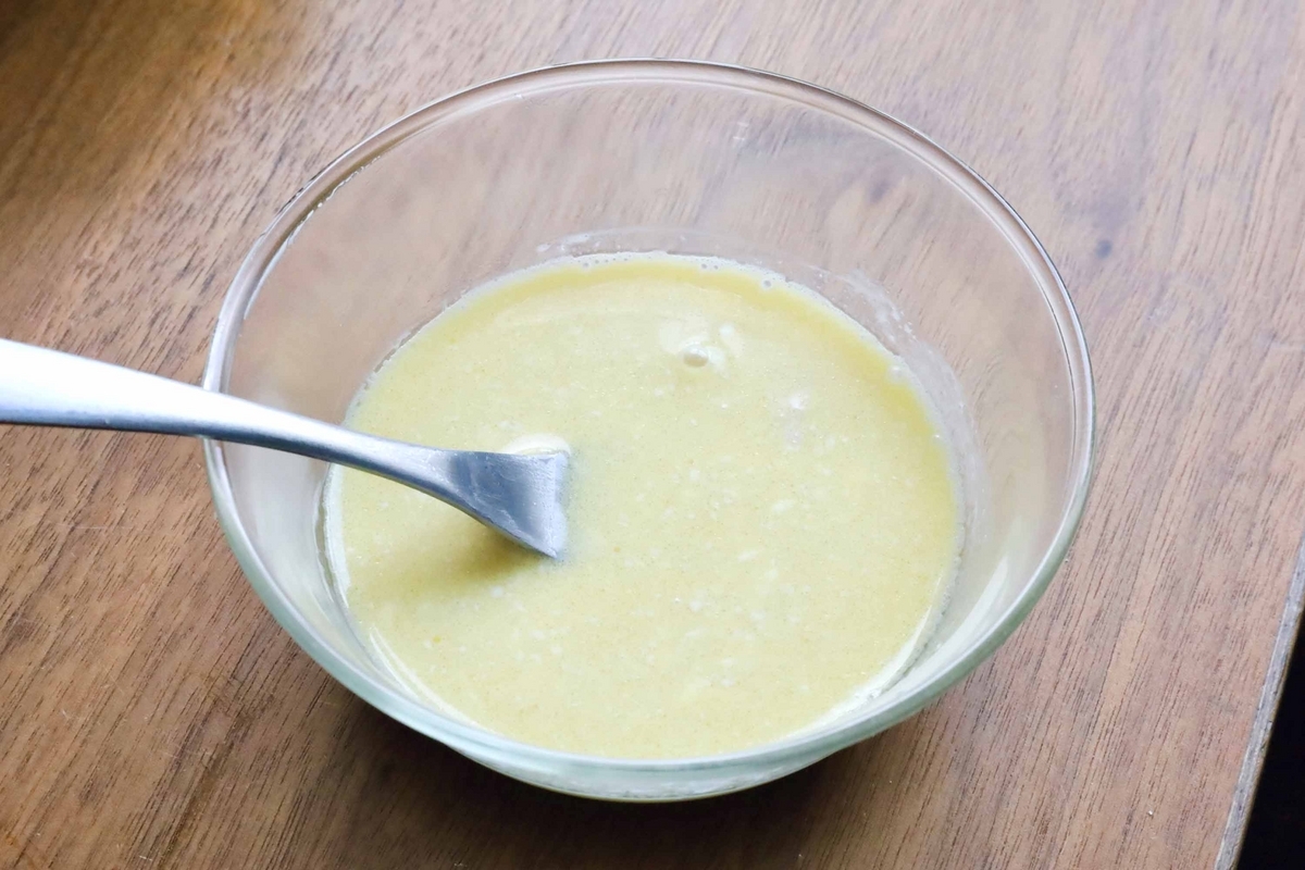 ざっくり混ぜます。強く混ぜると卵黄と卵白がバラバラになるので注意~!