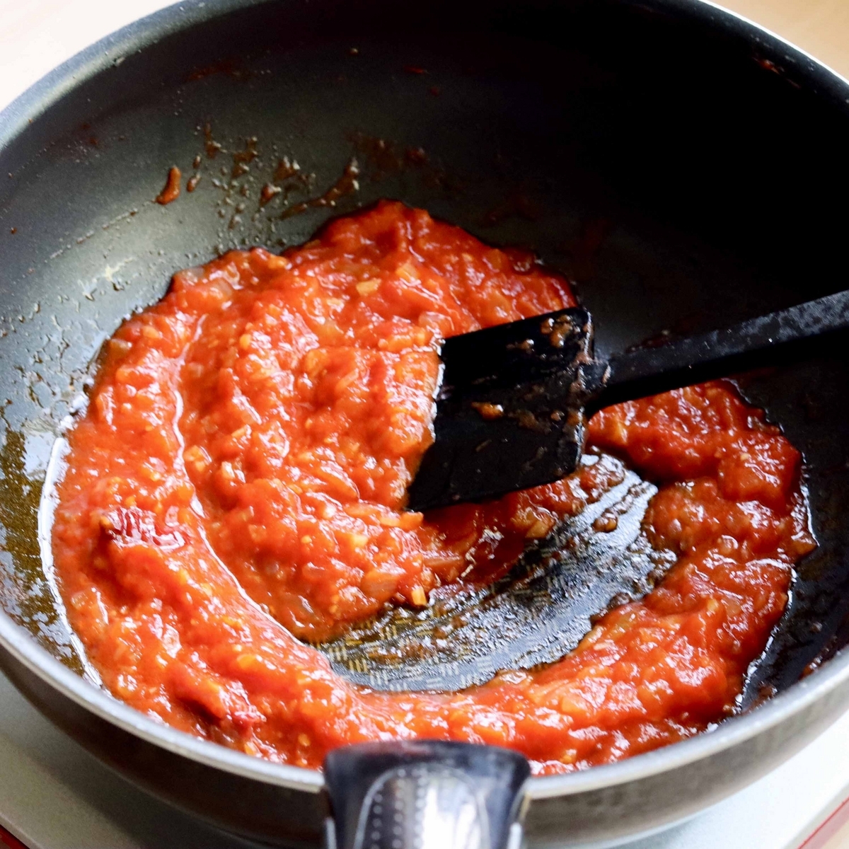シャバシャバ→粘度がついてトロっとするまで煮詰めていきます。この時、火を強くしすぎると、トマトソースがめちゃくちゃ跳ねるので注意⚠