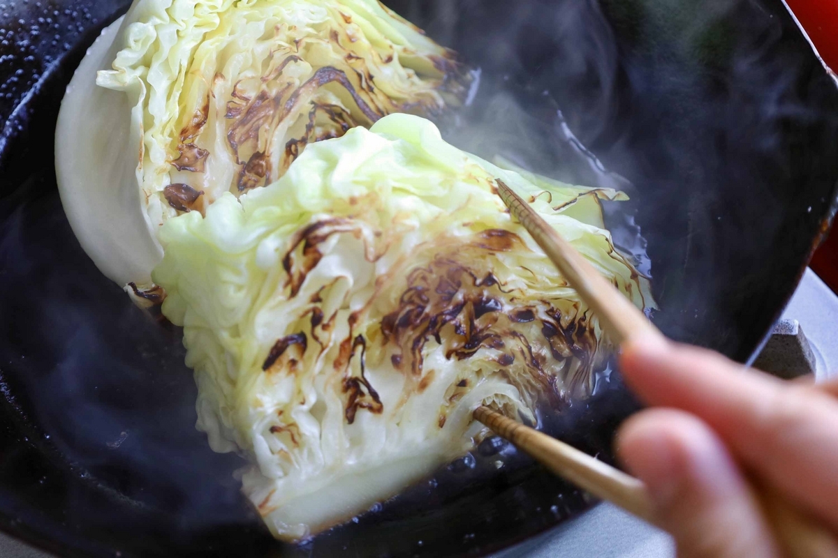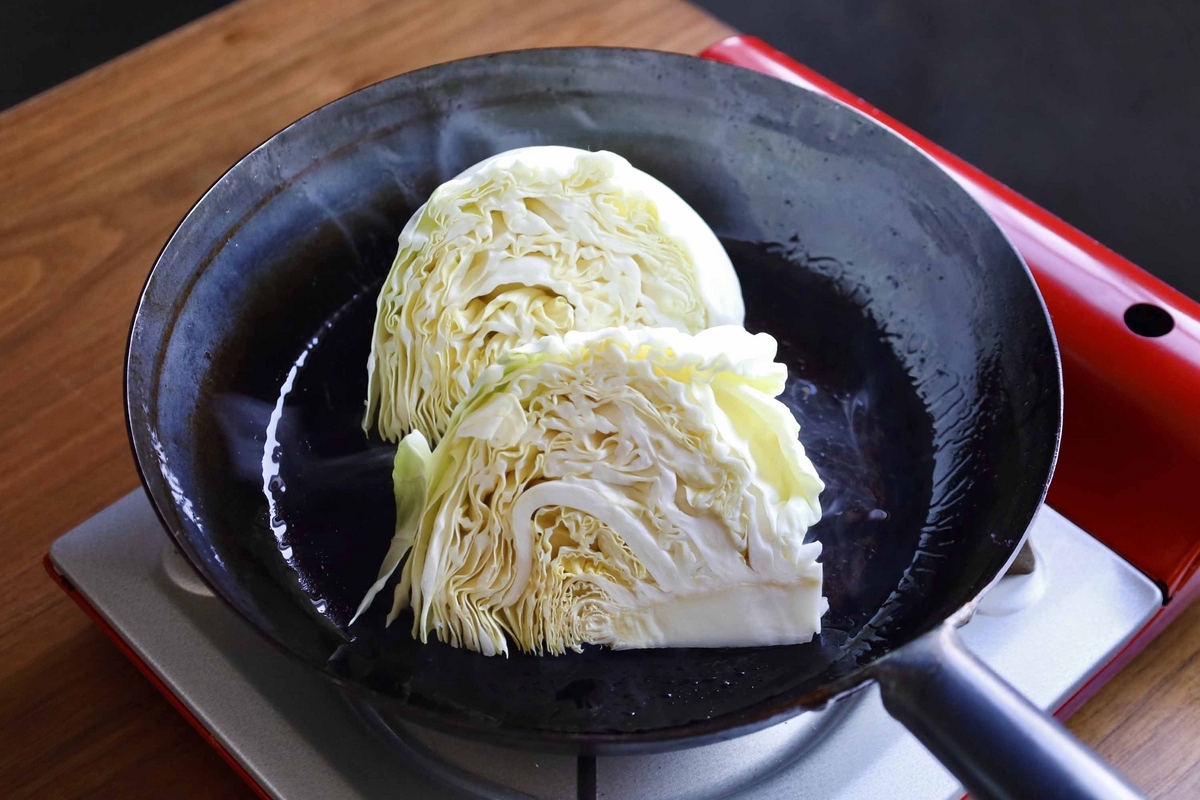 キャベツは両面ジリジリ焼いて酒蒸しに!