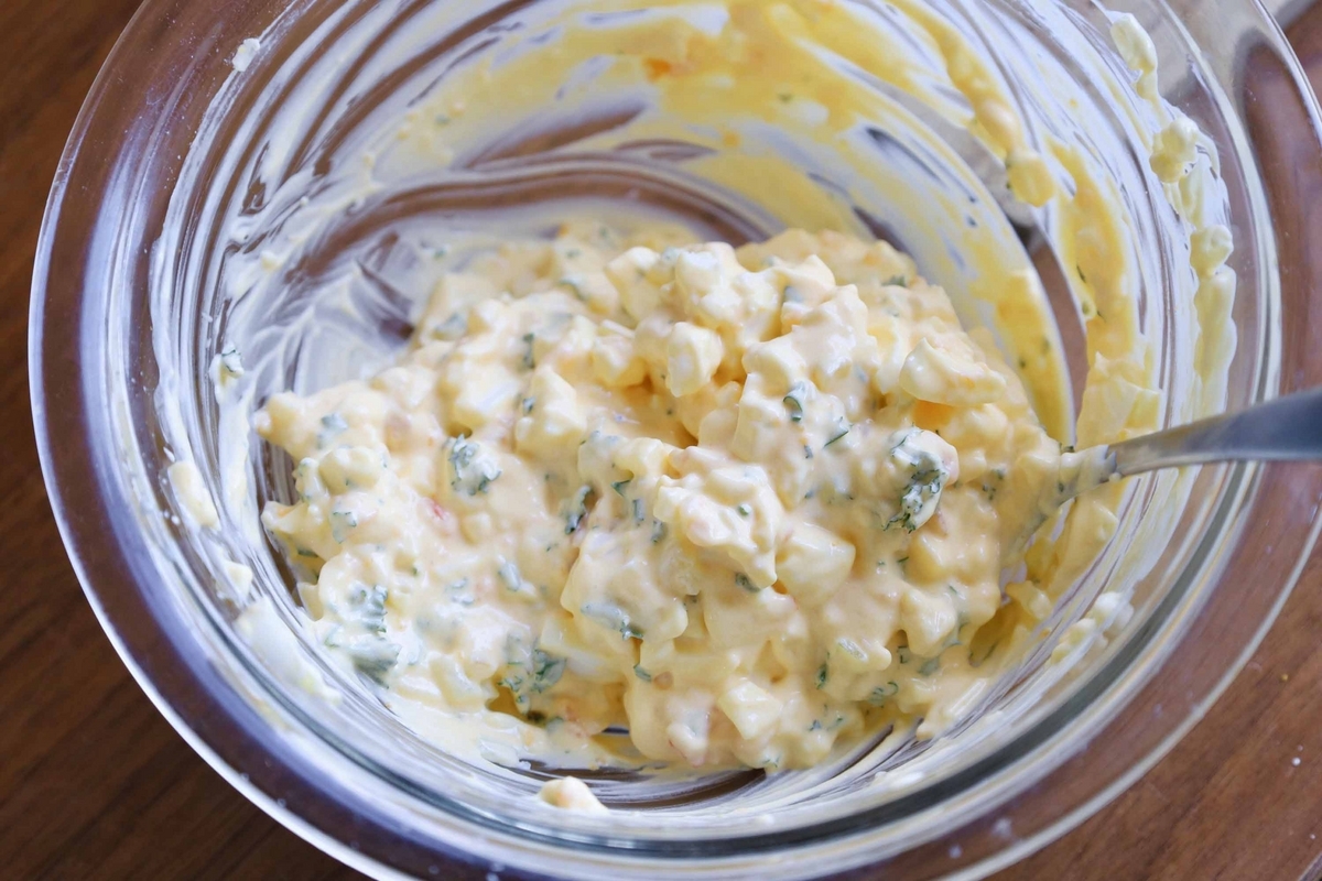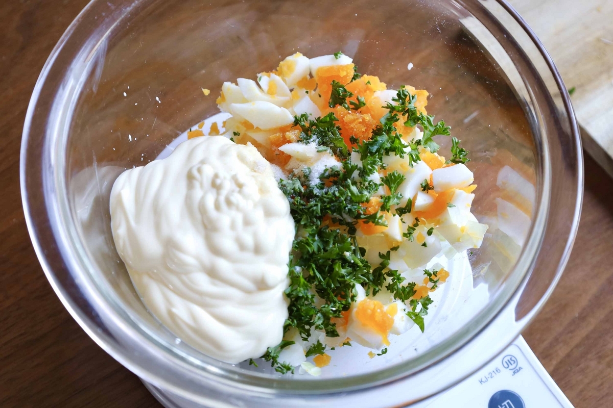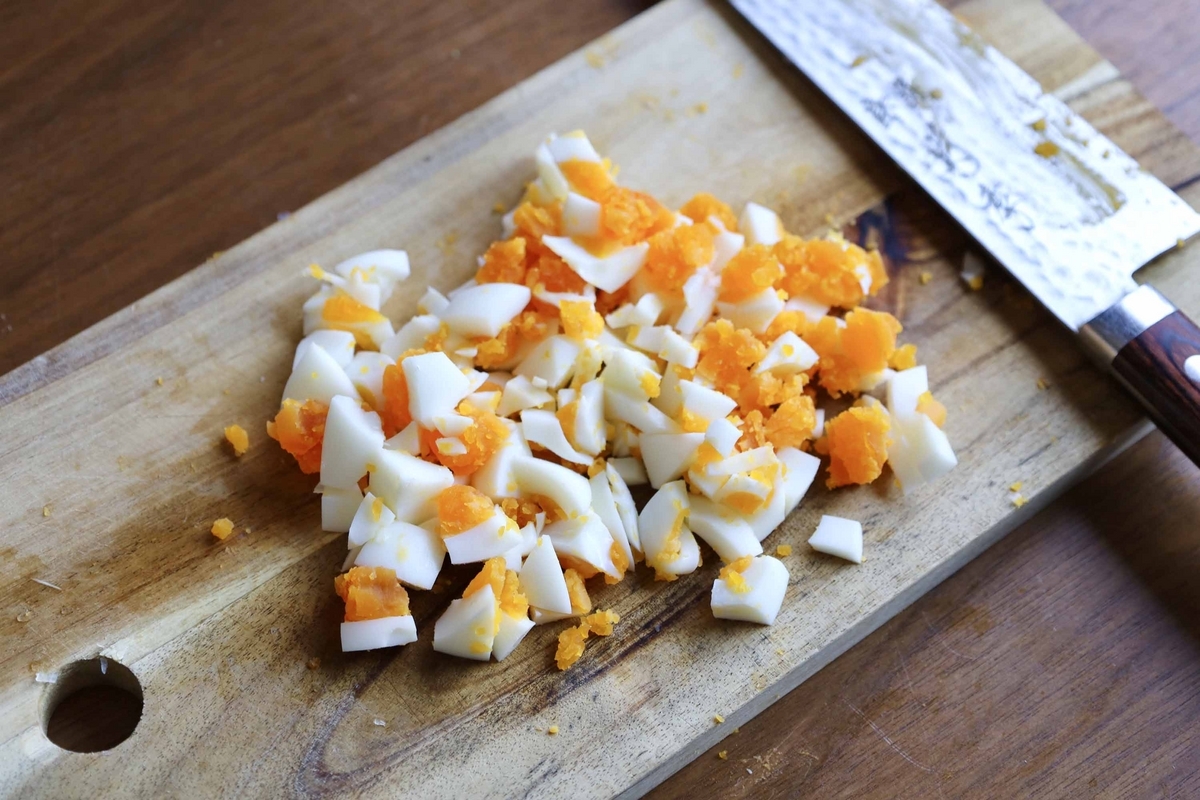 沸騰したお湯に、冷蔵庫から出したての卵2個を入れたら9分茹でます。流水に当てながら殻を剥いたら、粗目のみじん切りに!