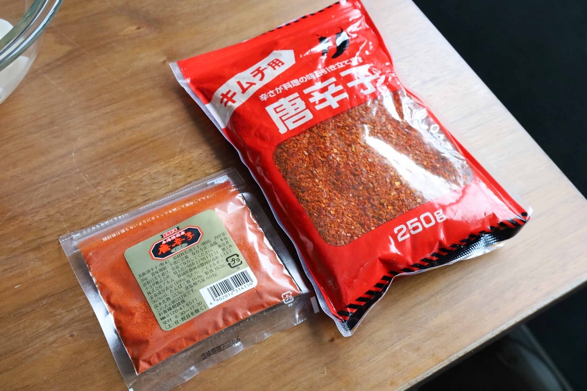 ちなみに今回使用する粉唐辛子は、右側のあらめのタイプ。業務スーパーで300円くらいで売っているので、是非のぞいてみて!(左側の細かい方は成城石井で購入)