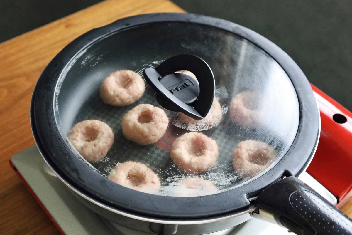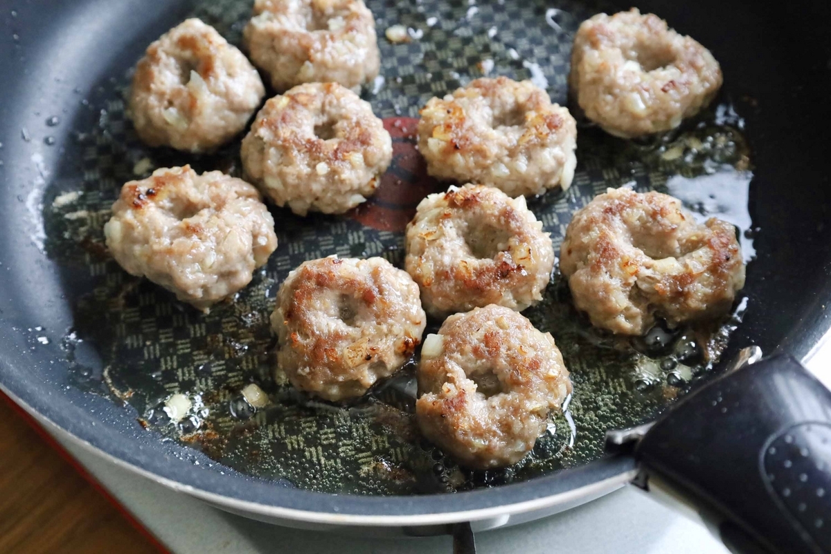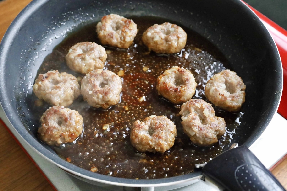 フライパンに肉だねをのせたら焼いていくんですが、もし可能ならお肉の表面にうっすら片栗粉をまぶしてから焼いてみて!!たれを絡める時にめっちゃよく絡むから!!!