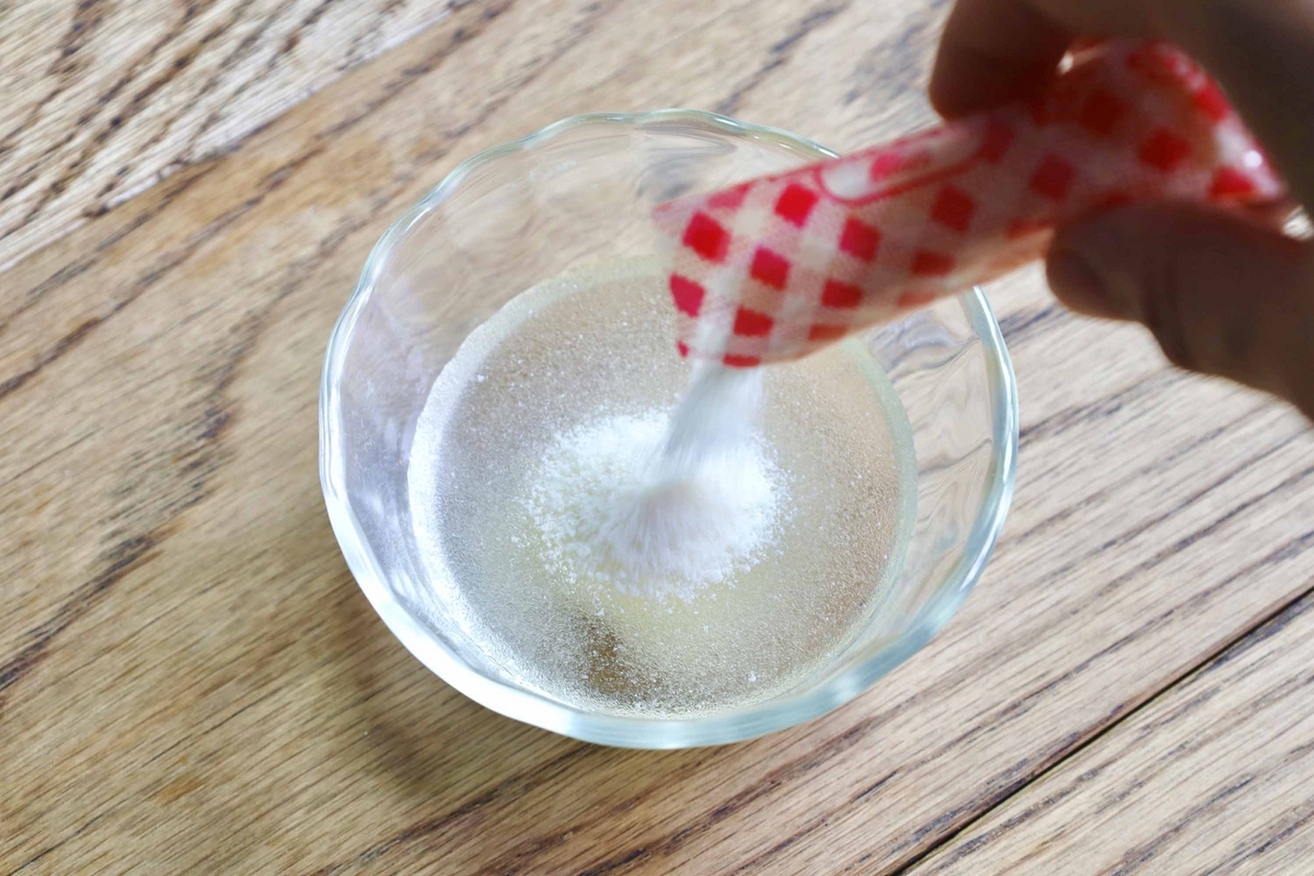 余談ですが、水に粉ゼラチンをふりかけた方が、きれいに溶けやすいです(スプーンですぐさま混ぜるなら逆でもOK)