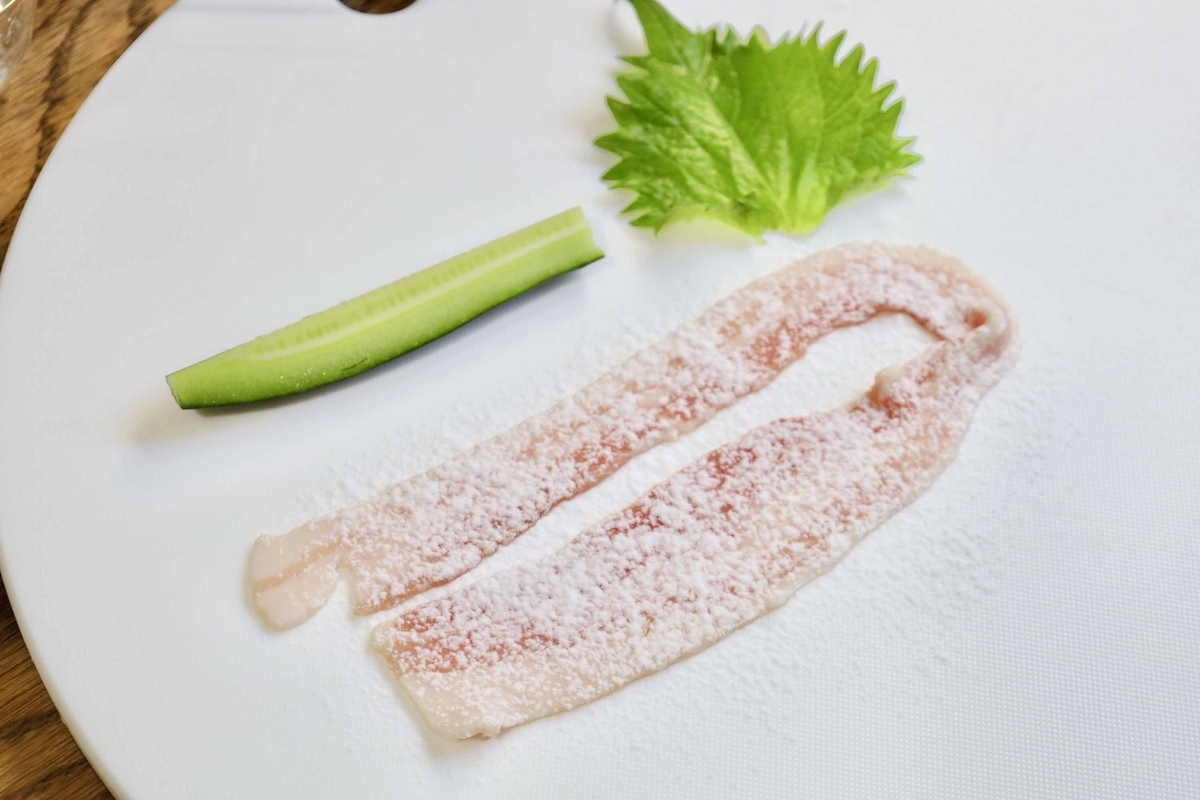 こんなかんじで8本作ります。もし可能なら、表面にも片栗粉をまぶしてみて!こうすることで、冷やしても豚肉が柔らかく仕上がるし、たれがよ~~く染みるよ✌✨