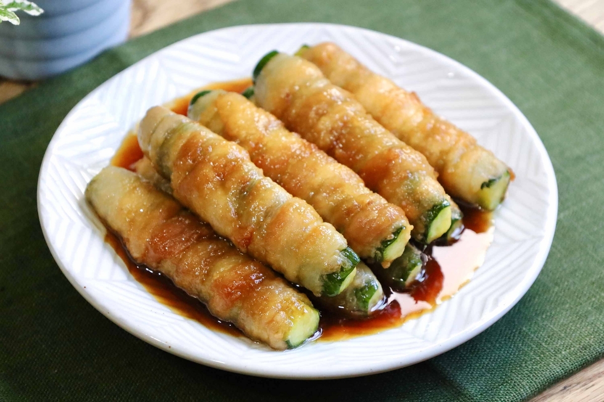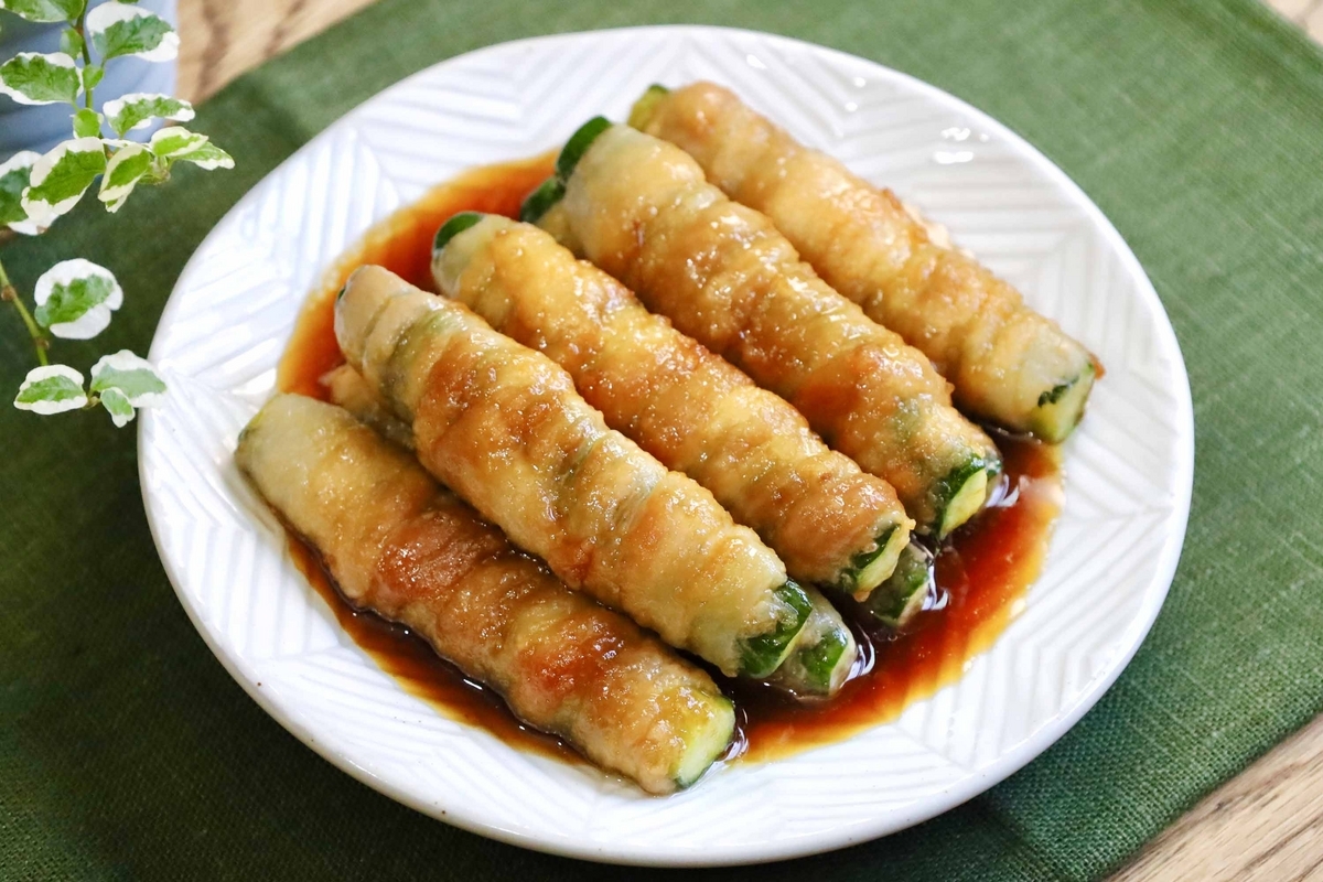 きゅうりと大葉を豚バラで巻いて焼き、甘じょっぱいたれに漬けていただきます。