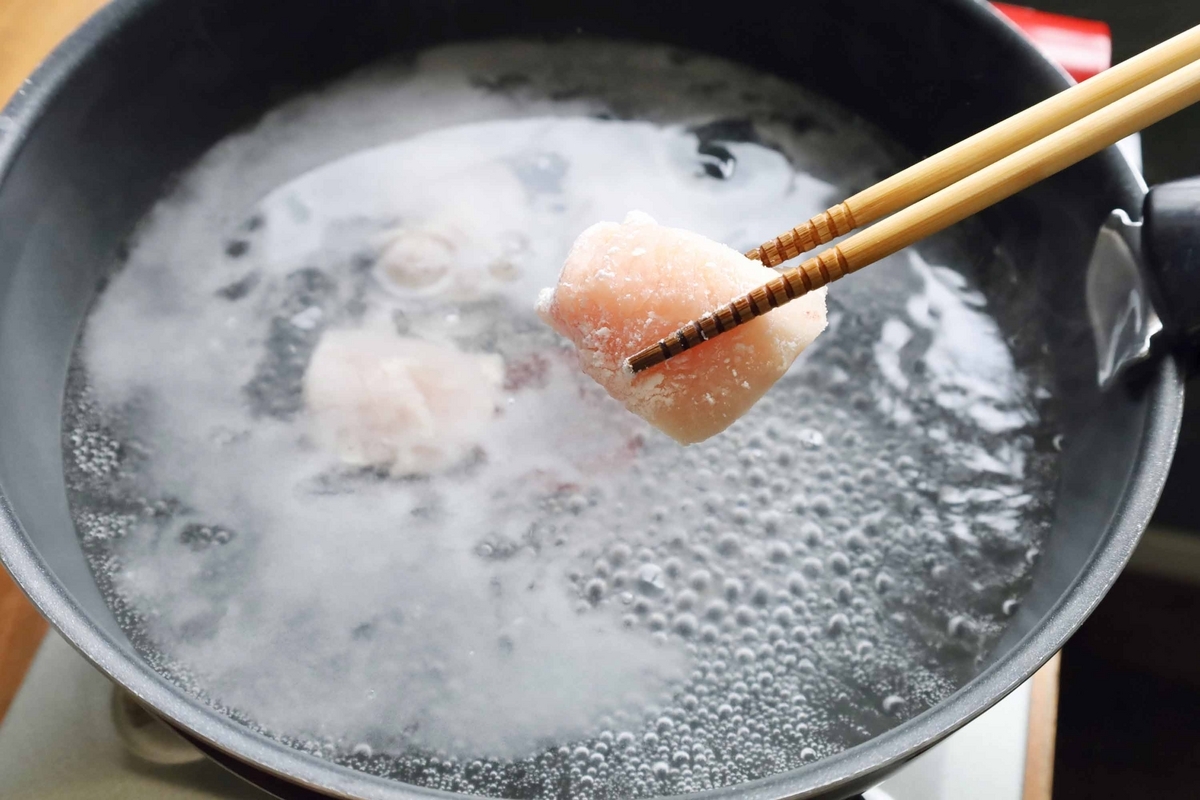 フライパンにたっぷりのお水を沸騰させたら、お肉を投入!