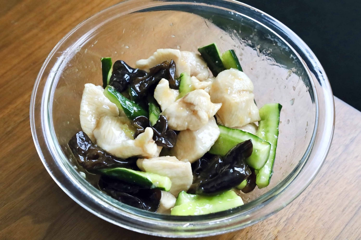 きくらげ+きゅうり+鶏肉と一緒に絡めます
