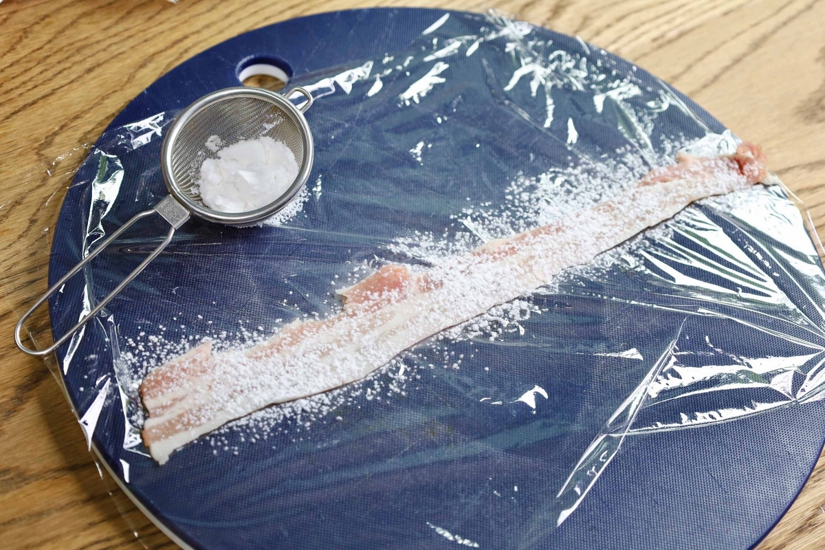 ごはんの準備ができたら、豚バラ肉6枚に片栗粉をうっすら振って