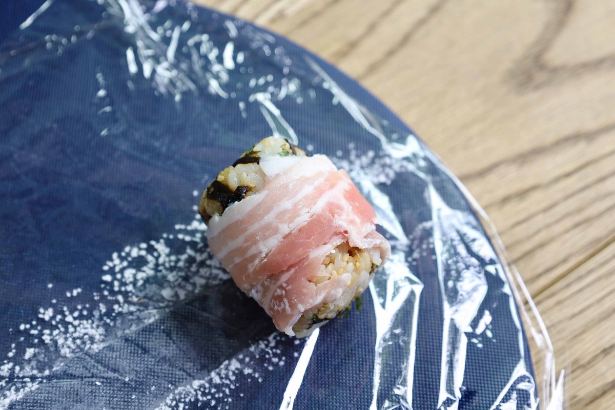 片栗粉を振った面がおにぎりにくっつくように巻き付けます