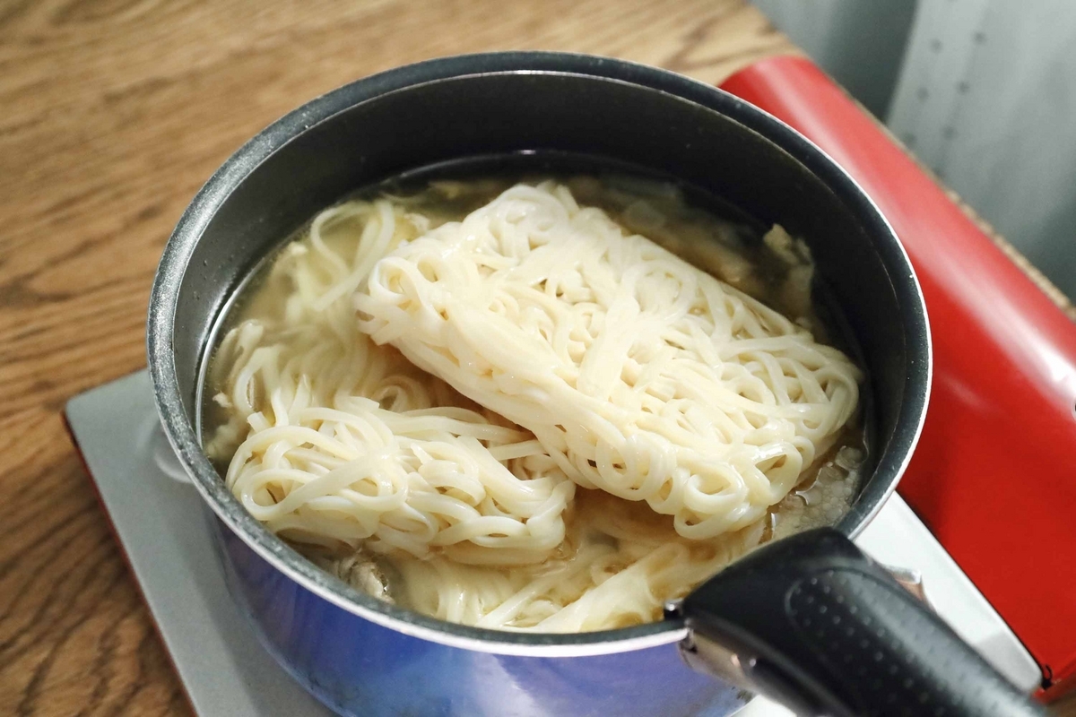うま味たっぷりのスープが出来上がったら、うどんを入れる場合はここで投入してほぐします。だいたい3玉が限界かな~(いっぱいいっぱい)