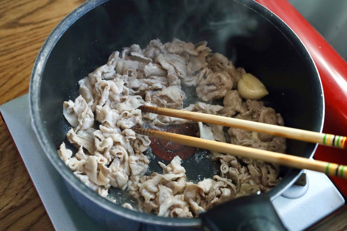 まずは鍋に油を垂らして、豚バラ+にんにくを投入!弱火で炒めていきましょう。油は何でもOKですが、ごま油で炒めると風味がよくなるのでおすすめです🙌