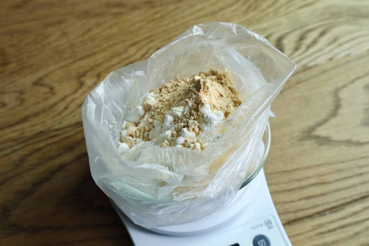 最初から、材料ぜ~んぶビニール袋で混ぜちゃってもいいんだけど…今回はより、ダマになりにくい&混ぜやすいレシピを書いていきます!