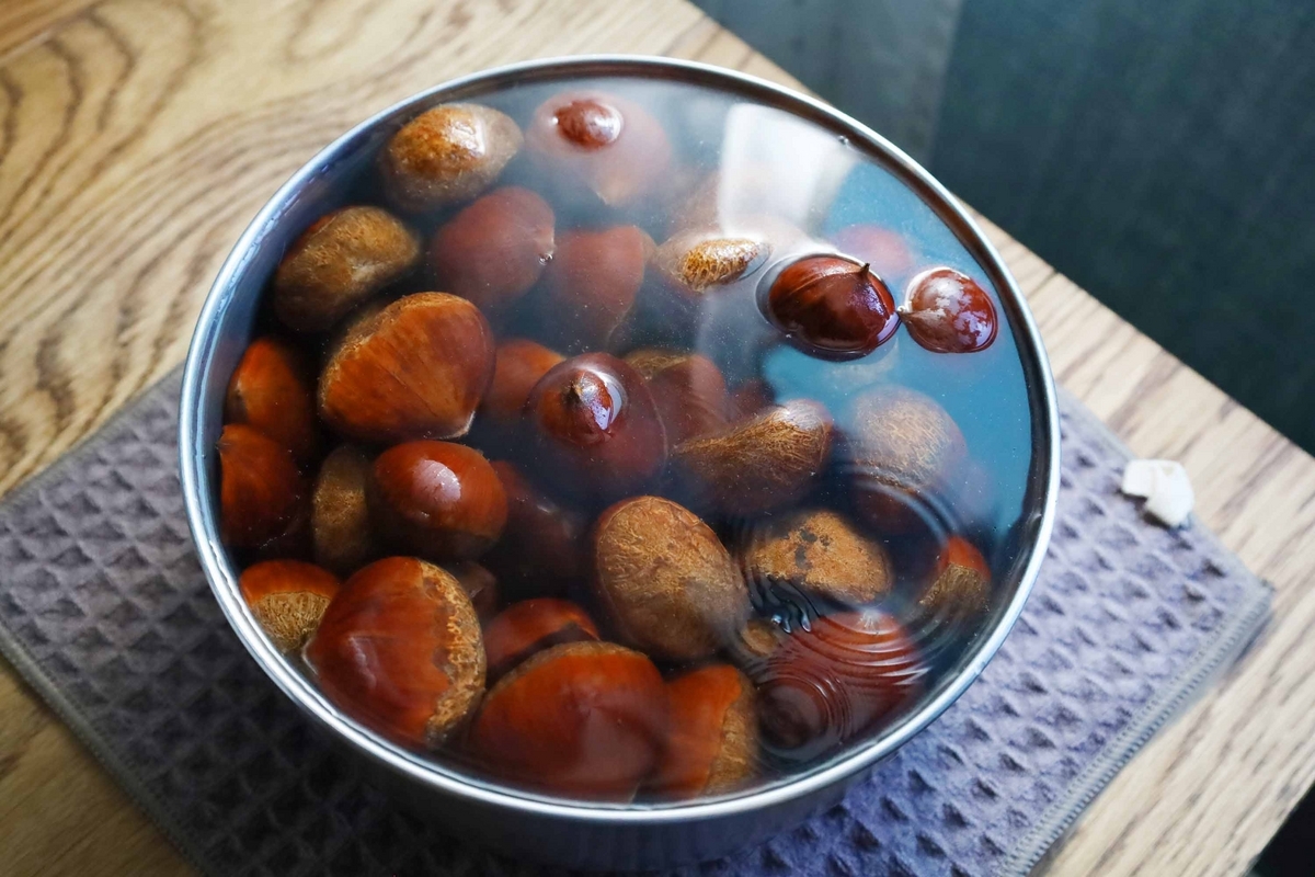 まずはたっぷりのお湯(約40度くらい)に栗を2時間以上浸しておきましょう