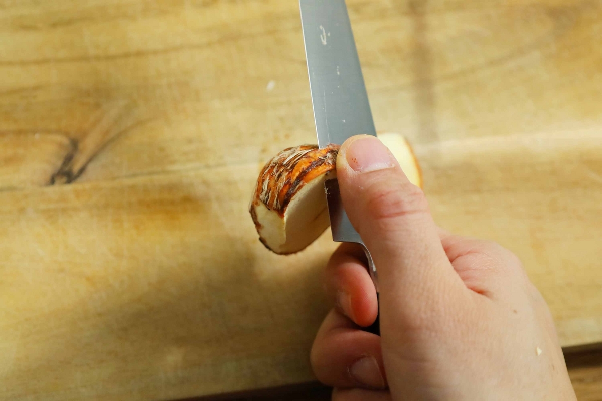 ザラザラのおしり(底)の部分をカット!この時、黄色い実の部分が切れちゃって大丈夫です◎