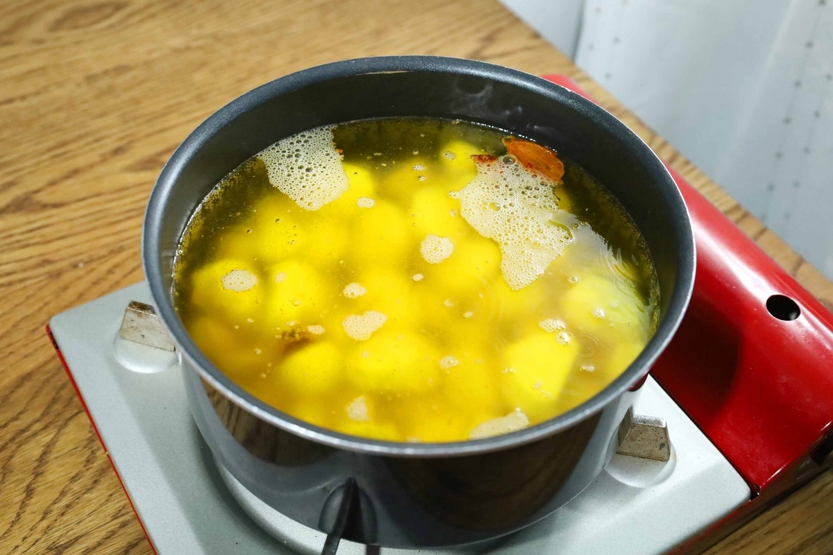 おススメの作業日程は、❶、❷、❸を前日の夕方~夜に。一晩放置した翌朝に、❹を行う流れです。くちなしに浸す時間を短くすることが可能ですが、その分色味よく仕上がらなかったりするので注意⚠
