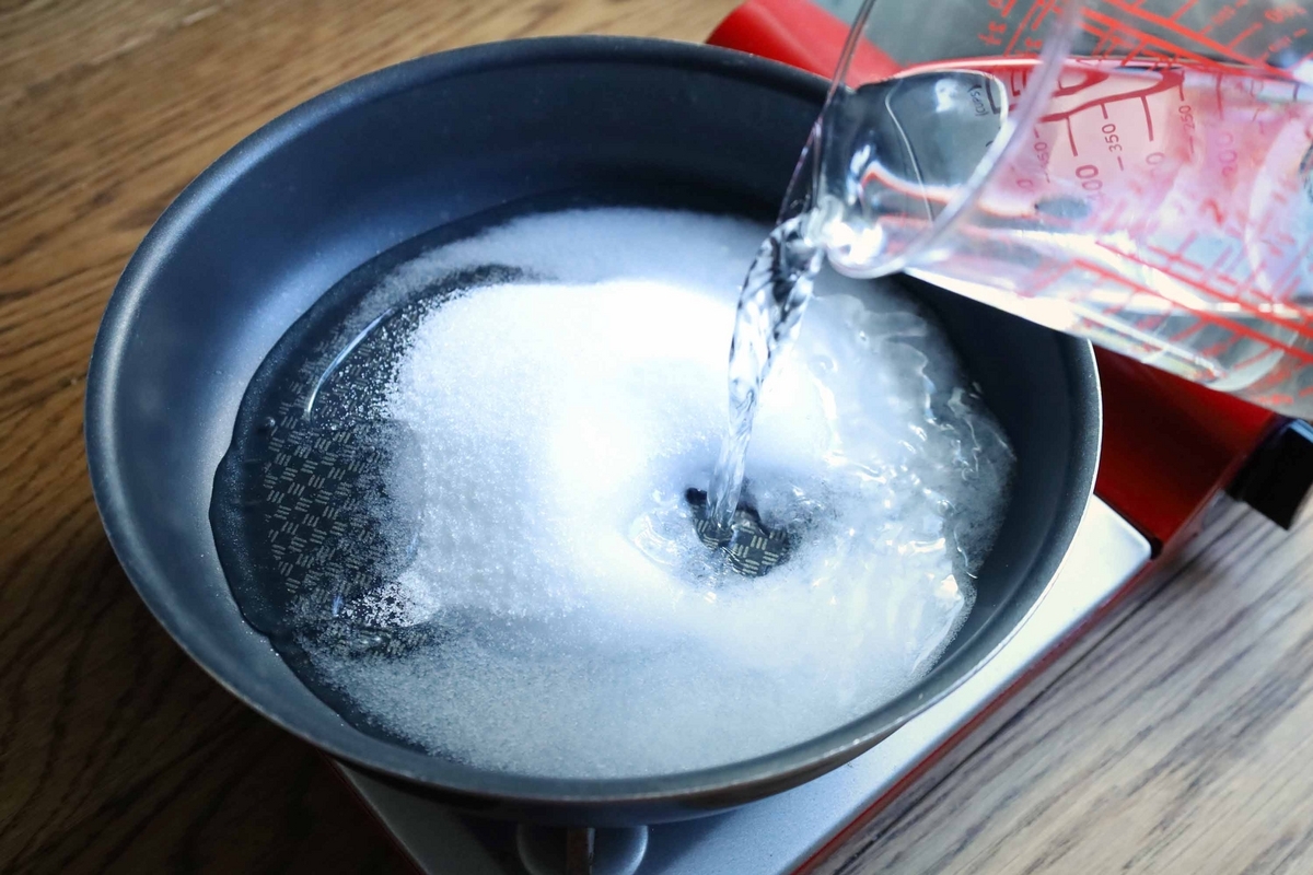 大きめのフライパンに水500㏄+砂糖300gを入れて、加熱。