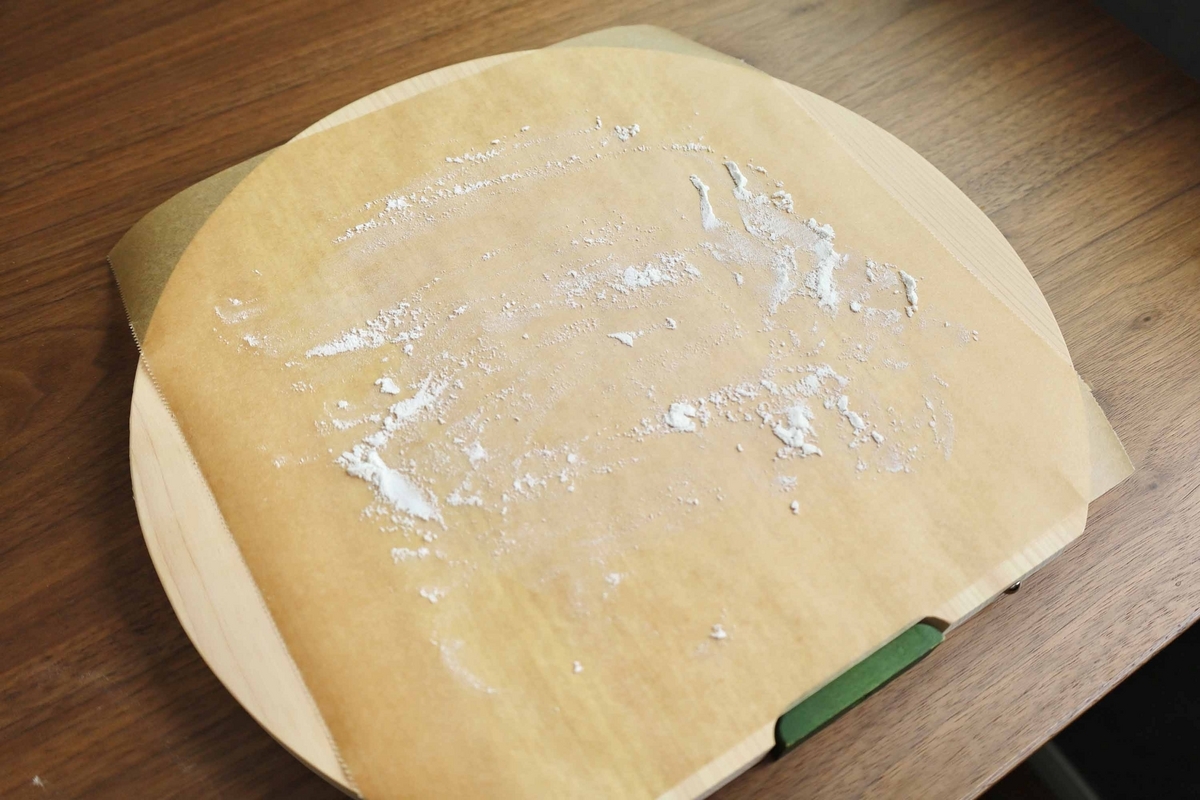 まな板の上にクッキングシートを広げ、強力粉で打ち粉をします。